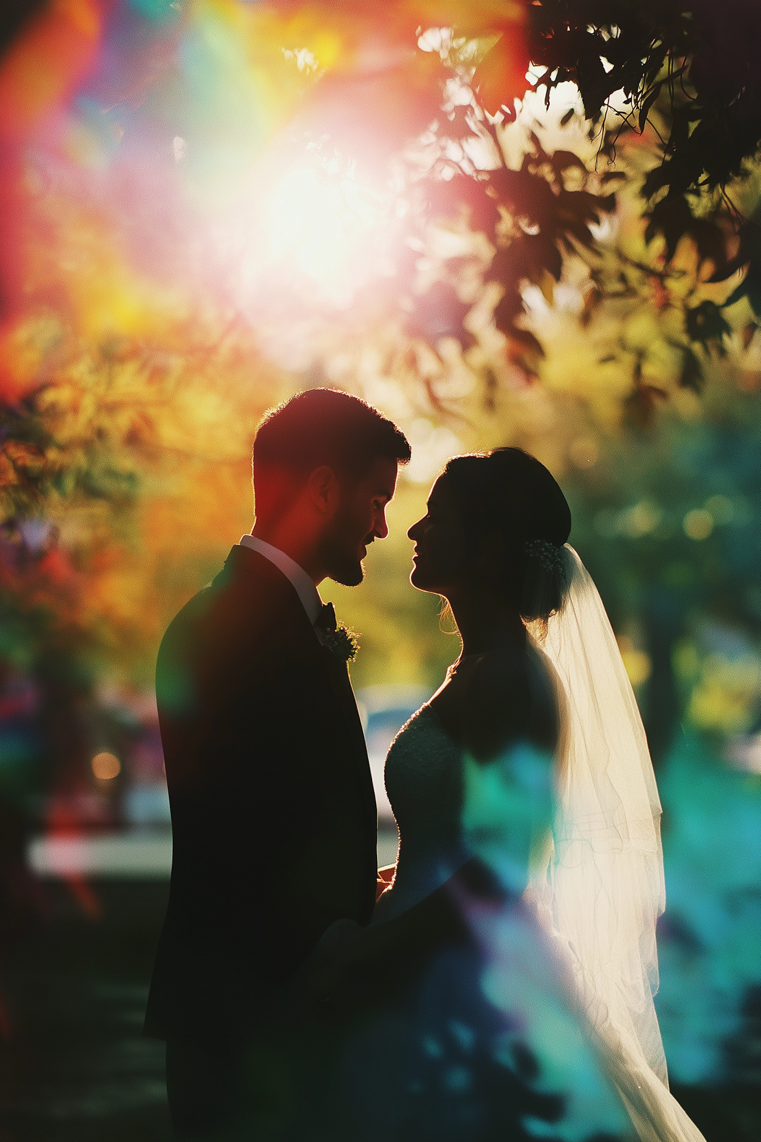 Silhouetted couple in a romantic embrace with vibrant, colorful background, creating a dreamy and intimate atmosphere.