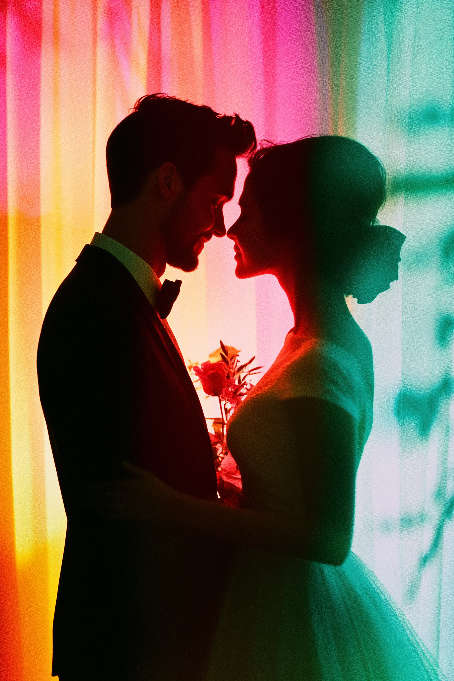 Silhouette of a romantic couple in wedding attire against a vibrant, colorful gradient background, exuding love and intimacy.