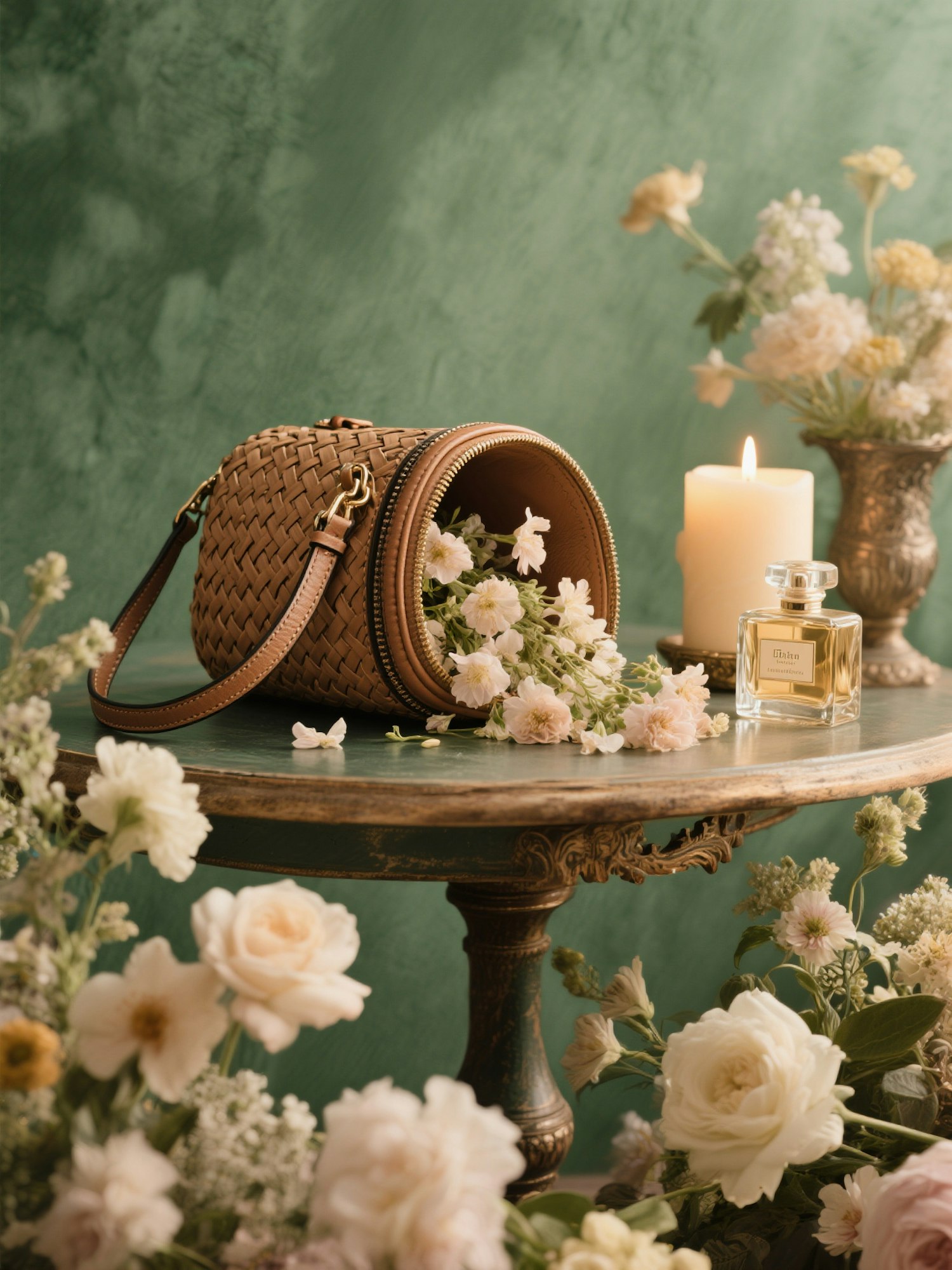 Elegant woven handbag with flowers, a lit candle, and perfume on a vintage table, surrounded by soft blooms and a green backdrop.