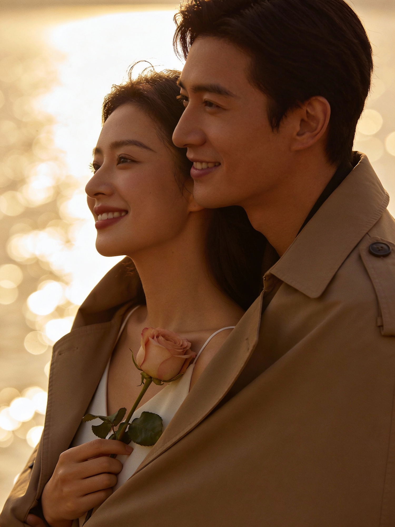 Ultra-realistic cinematic lifestyle photo, vertical 4:5. Golden hour outdoors with warm romantic glow. Side-angle medium close-up of a man and woman sharing one jacket draped around both shoulders; faces partially visible, quiet smiles, natural emotion. The woman holds a single rose close to her chest. Creamy bokeh background, soft flare, warm highlights. 35mm look, shallow DOF, crisp details, premium editorial retouch, subtle film grain. Negative prompt: logos, readable text, watermark, brand labels, staged posing, cheesy props, heart confetti, HDR, oversaturation, plastic-looking skin, over-smoothing, fake skin texture, overly perfect faces, deformed hands, extra fingers, distorted anatomy, unnatural body proportions, exaggerated facial expressions, forced smiles, harsh flash, heavy vignetting, excessive lens flare, motion blur on subjects, unrealistic lighting, over-sharpening halos, noise artifacts, banding.
