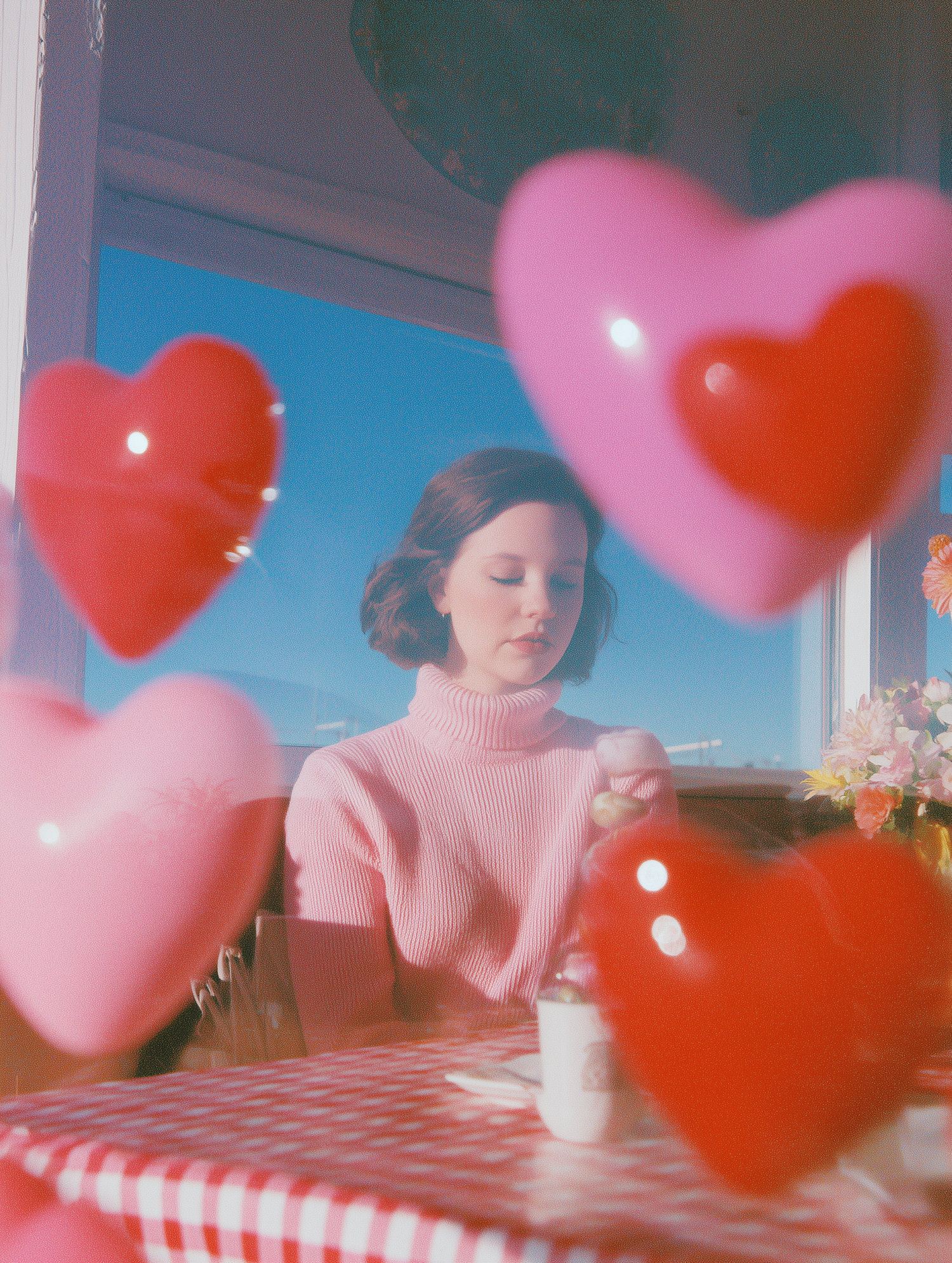 A serene scene of a woman in a pink sweater at a table with heart decorations and flowers, set against a clear blue sky.