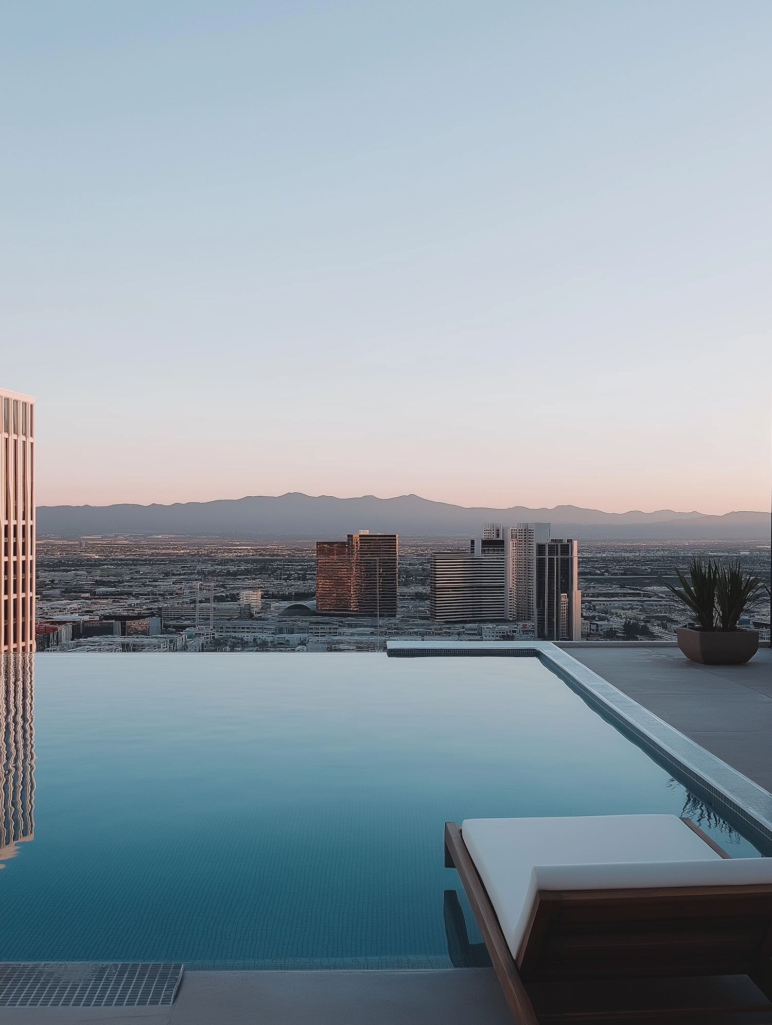 Rooftop infinity pool with city and mountain views at sunset, featuring a modern lounge chair and serene ambiance.