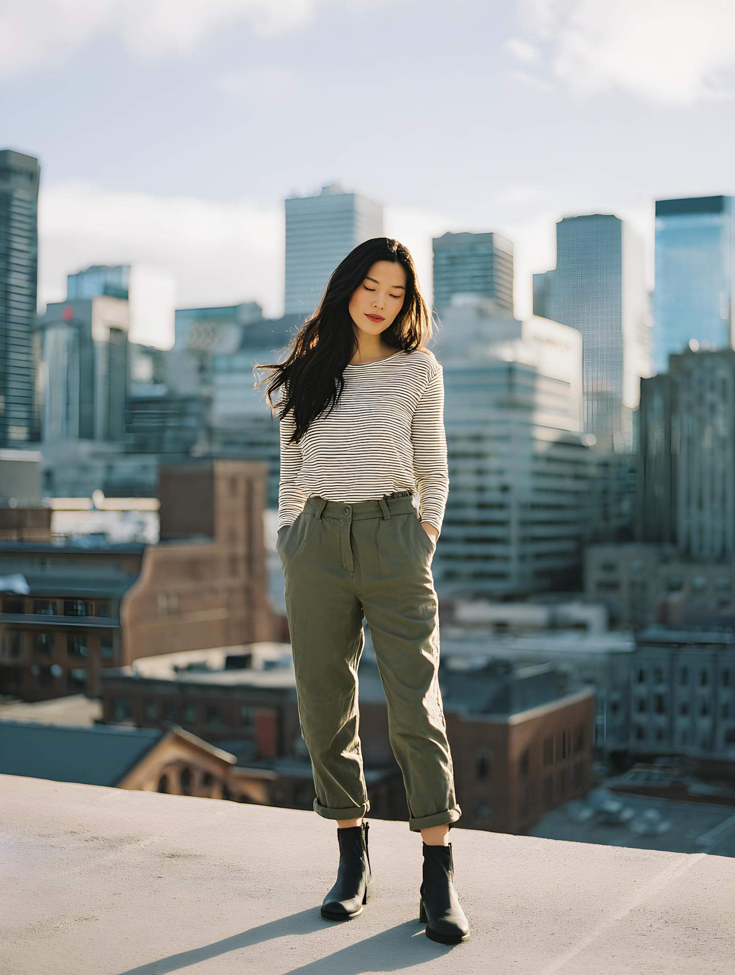 A stylish woman on a rooftop with a city skyline backdrop, wearing casual attire and basking in the sunlight.