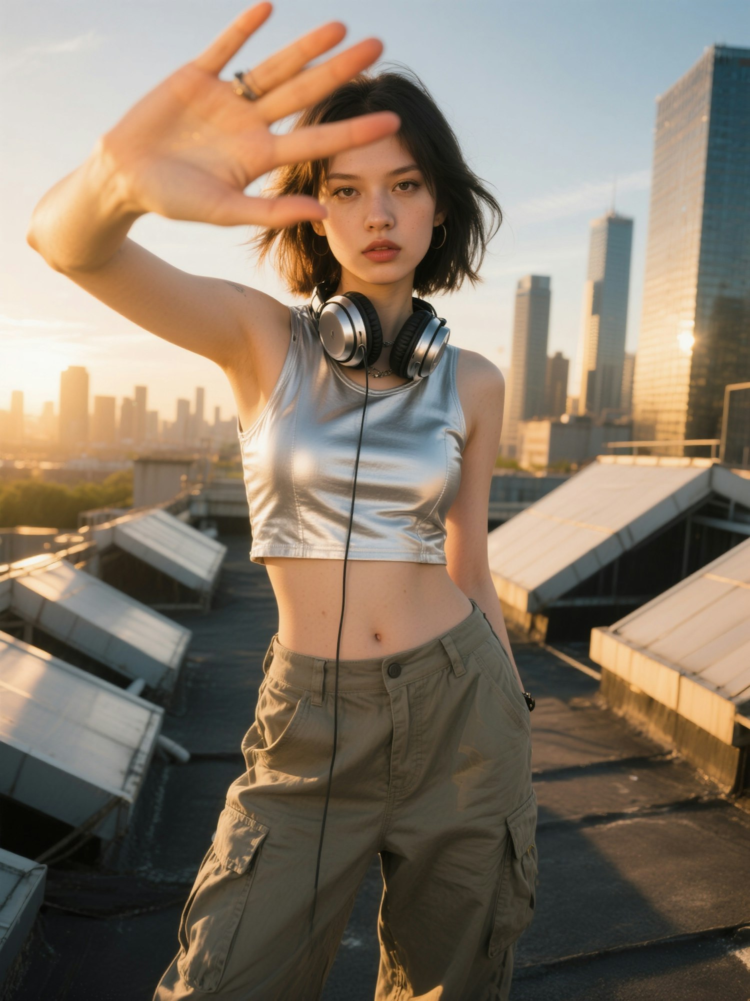 edgy girl in silver crop vest and baggy cargo pants, chunky headphones around neck, posing on a rooftop during golden hour, hand blocking lens, angular shadows across face, sharp geometry in background, attitude-filled expression, city skyline behind her --v 6 --ar 2:3