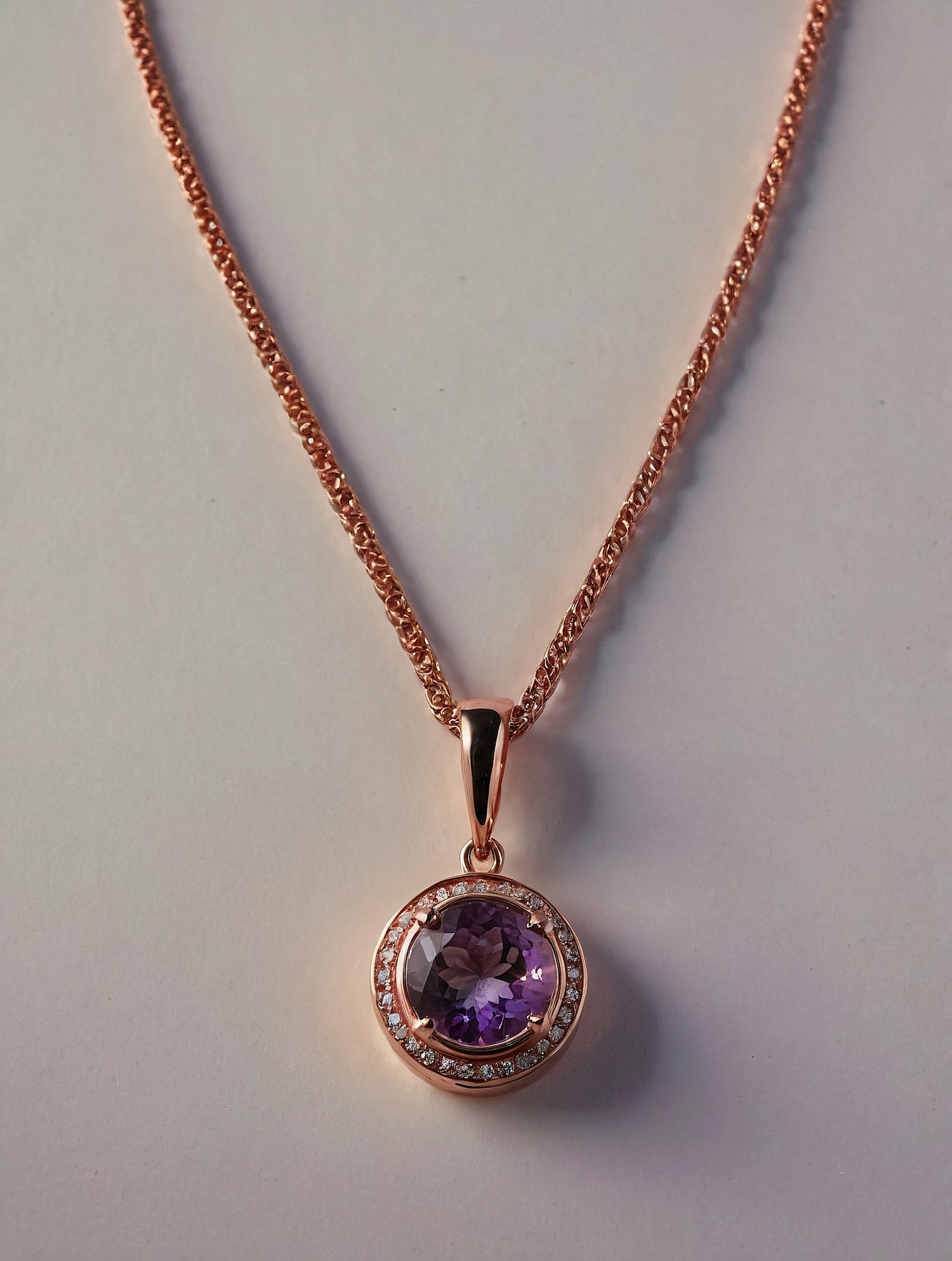 Elegant rose gold necklace with a purple gemstone pendant surrounded by sparkling stones, perfect for a sophisticated look.