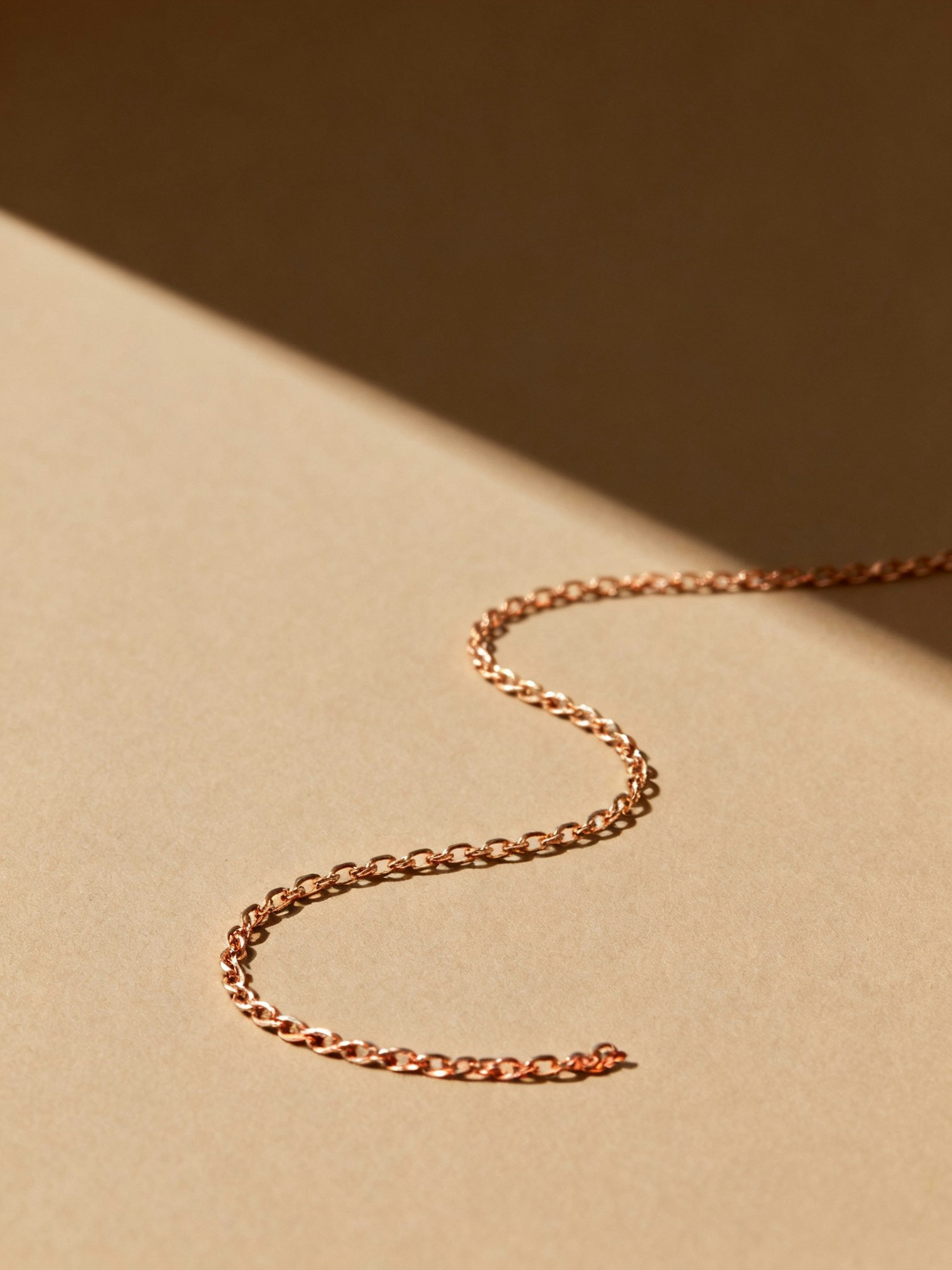 A rose gold chain elegantly displayed on a beige surface, with soft lighting highlighting its intricate details and warm tones.