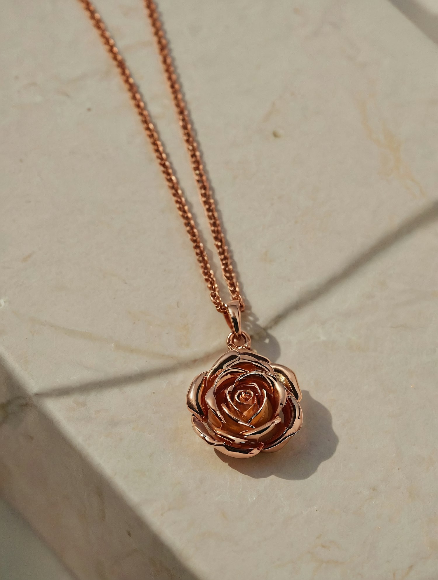 Elegant rose gold necklace with a rose-shaped pendant on a marble surface, showcasing intricate design and warm hues.