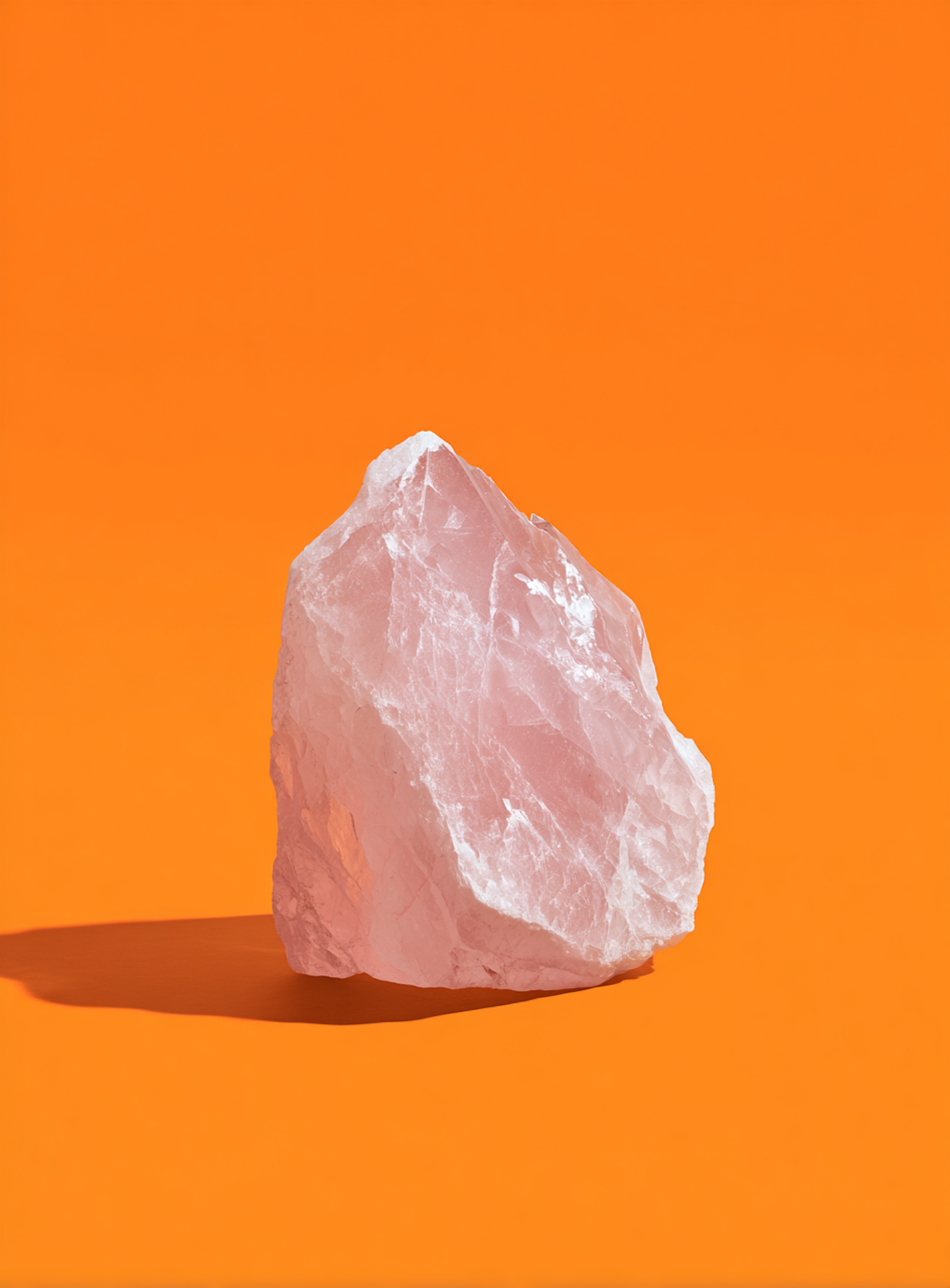 A raw rose quartz crystal on a bright orange background, showcasing its soft pink hue and rough texture in a minimalist setup.