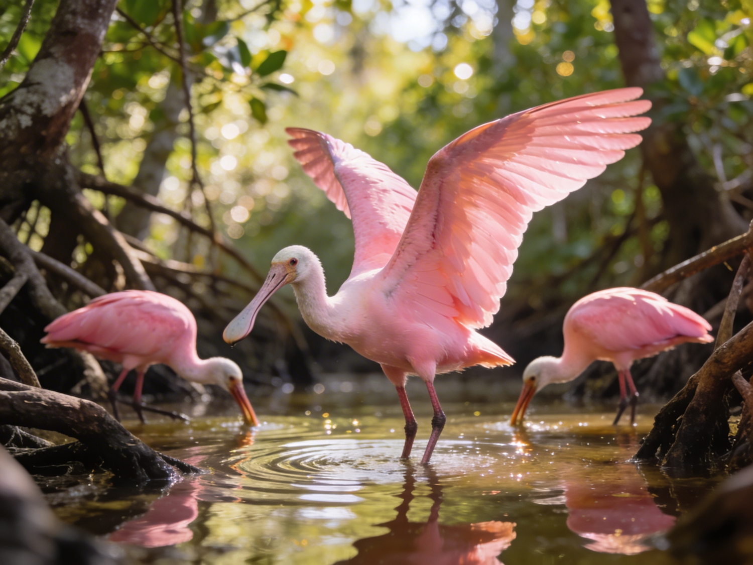 Three roseate spoonbills in a mangrove swamp, one with wings outstretched, creating a vibrant and serene natural scene.