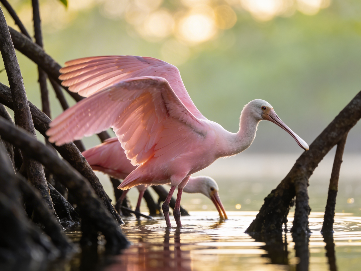 Two roseate spoonbills wade in shallow water among mangroves, one spreading its pink wings in soft sunlight, creating a serene scene.