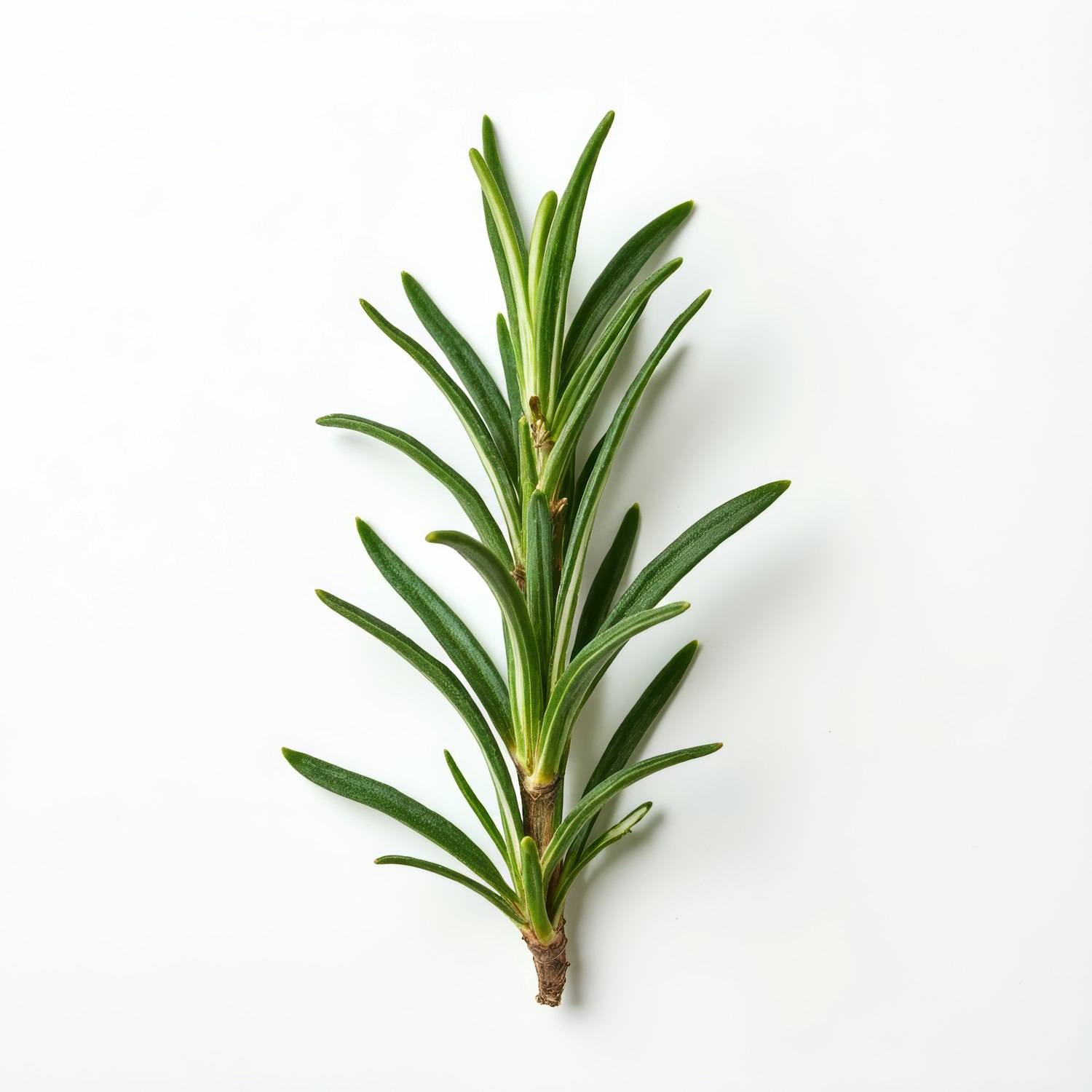 Fresh rosemary sprig on a white background, showcasing vibrant green leaves and a woody stem. Perfect for culinary or herbal use.