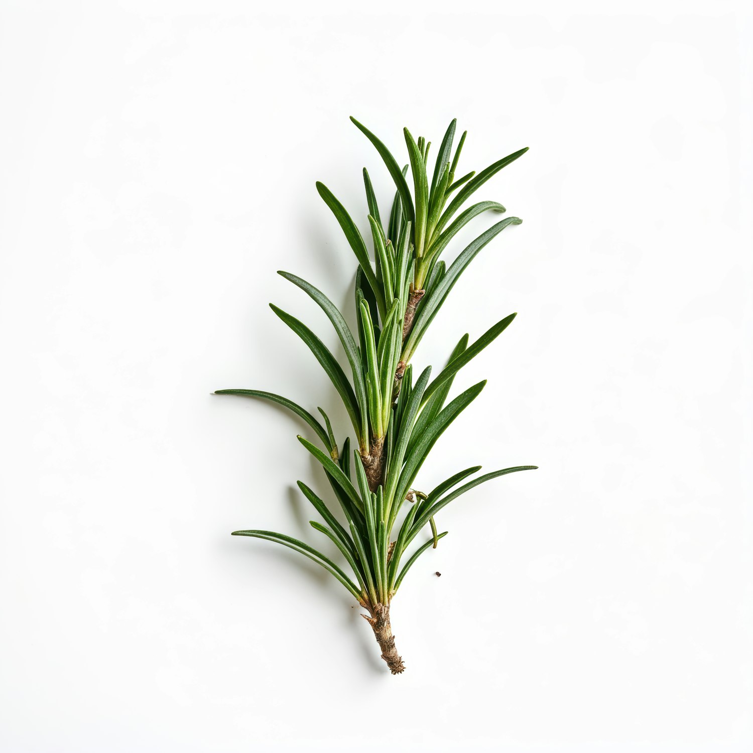 Fresh rosemary sprig on a white background, showcasing vibrant green leaves and a woody stem.