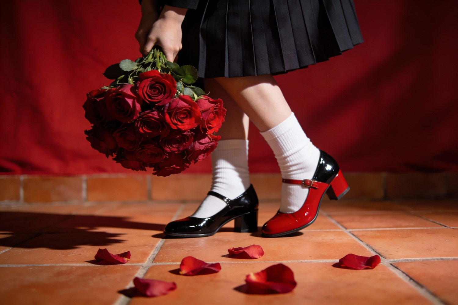 A cropped editorial shot featuring a person holding a bouquet of deep red roses, standing against a rich crimson backdrop. They wear a dark pleated skirt, crisp white socks, and glossy black‑and‑red heels. Soft spotlighting creates dramatic shadows, while scattered rose petals on terracotta tiles add a romantic, cinematic mood.