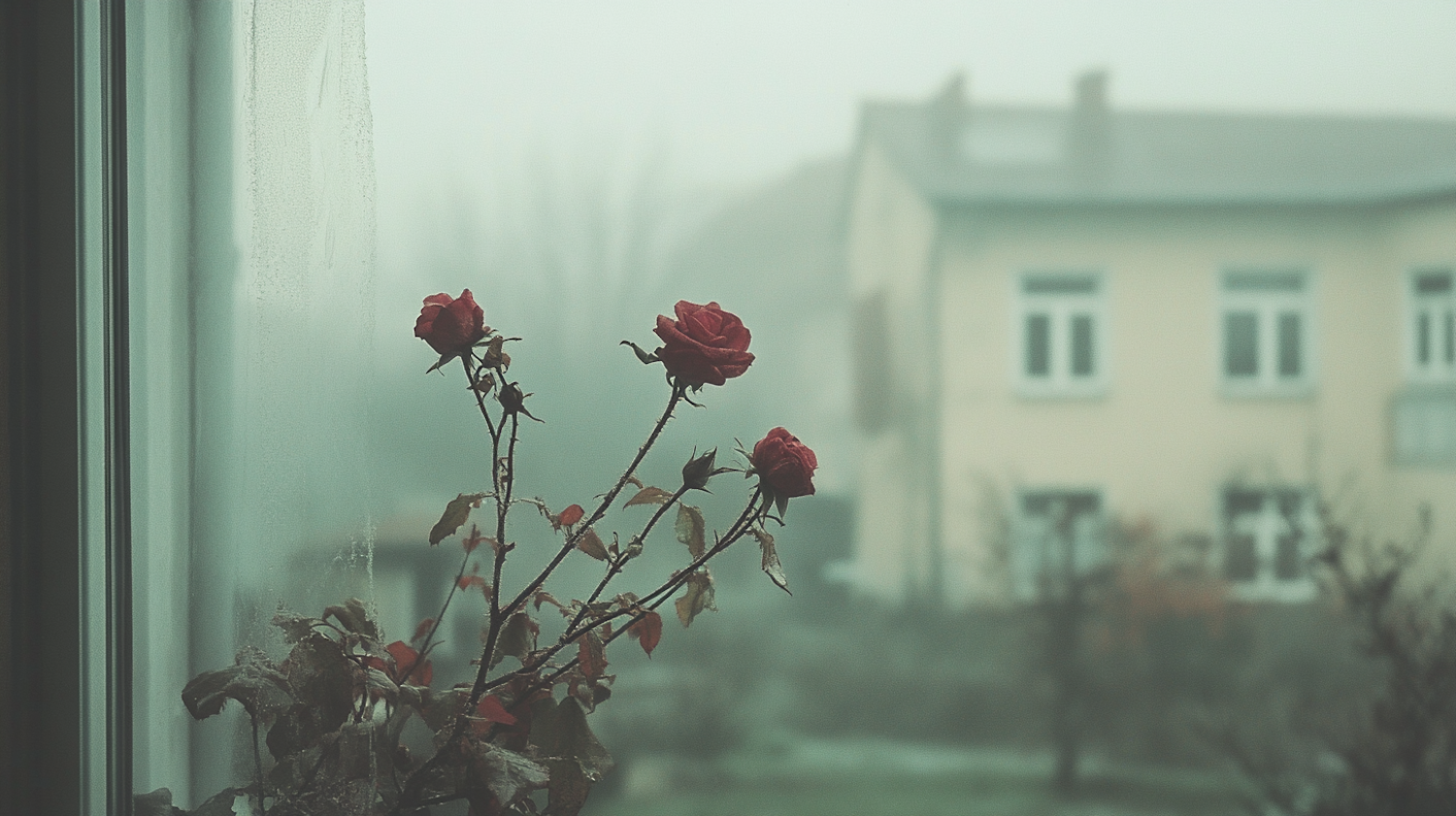 Red roses by a foggy window with a blurred building in the background, creating a tranquil and melancholic atmosphere.