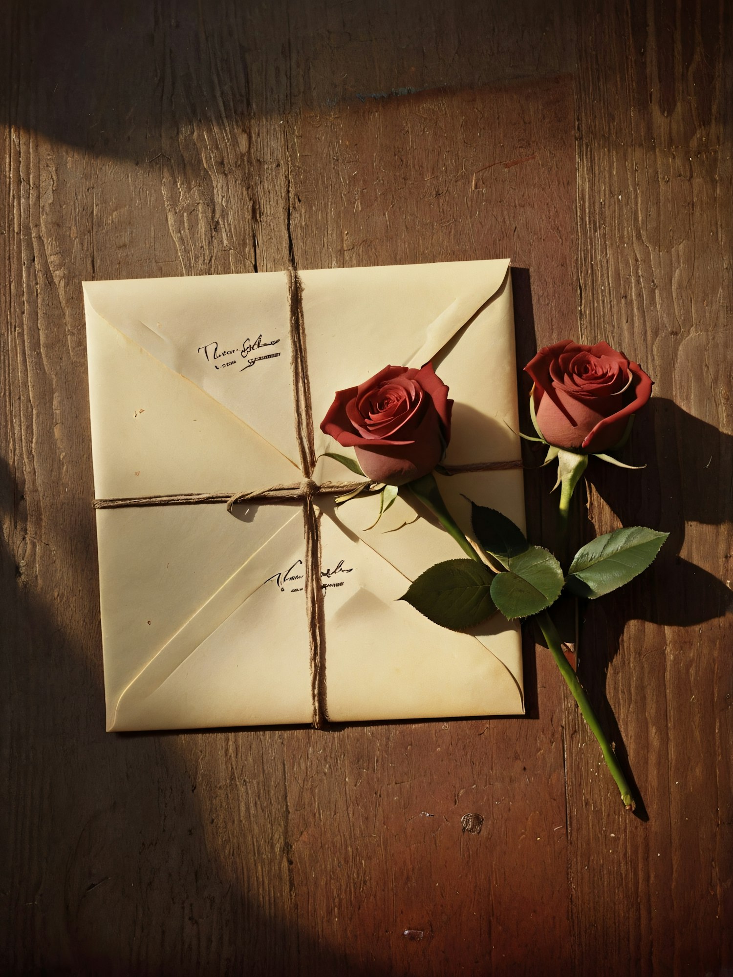 Vintage envelopes tied with string and adorned with red roses on a rustic wooden surface, bathed in warm sunlight.