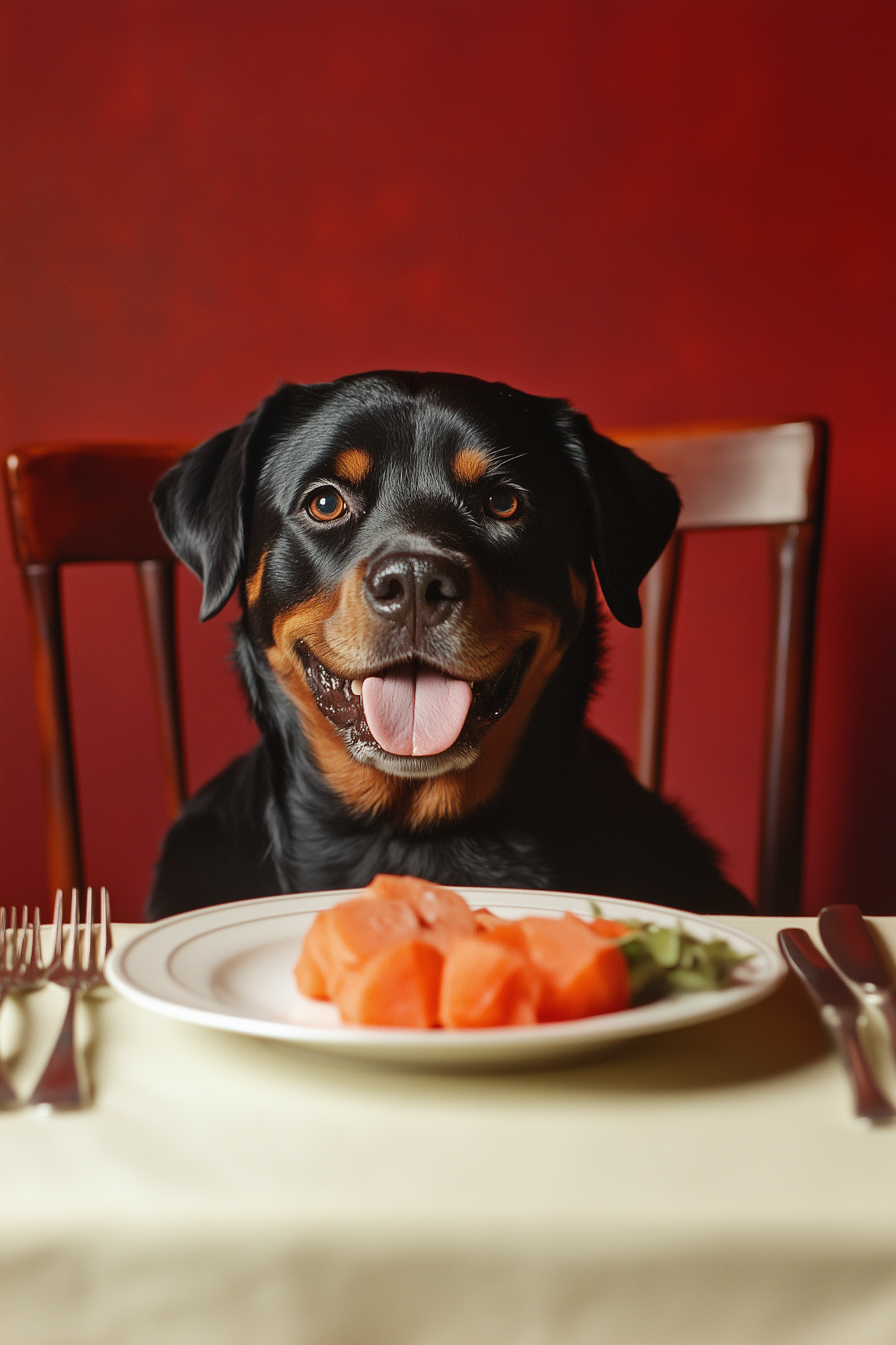A happy Rottweiler sits at a dining table with a plate of carrots and green beans, set against a warm red background.