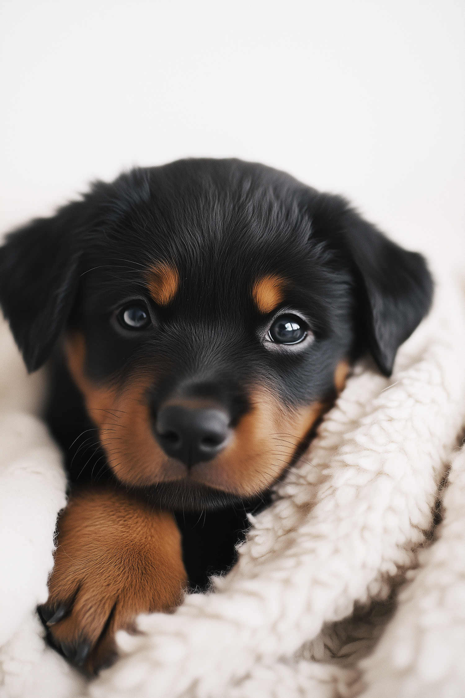 Adorable Rottweiler puppy snuggled in a fluffy white blanket, showcasing its cute face and expressive eyes.