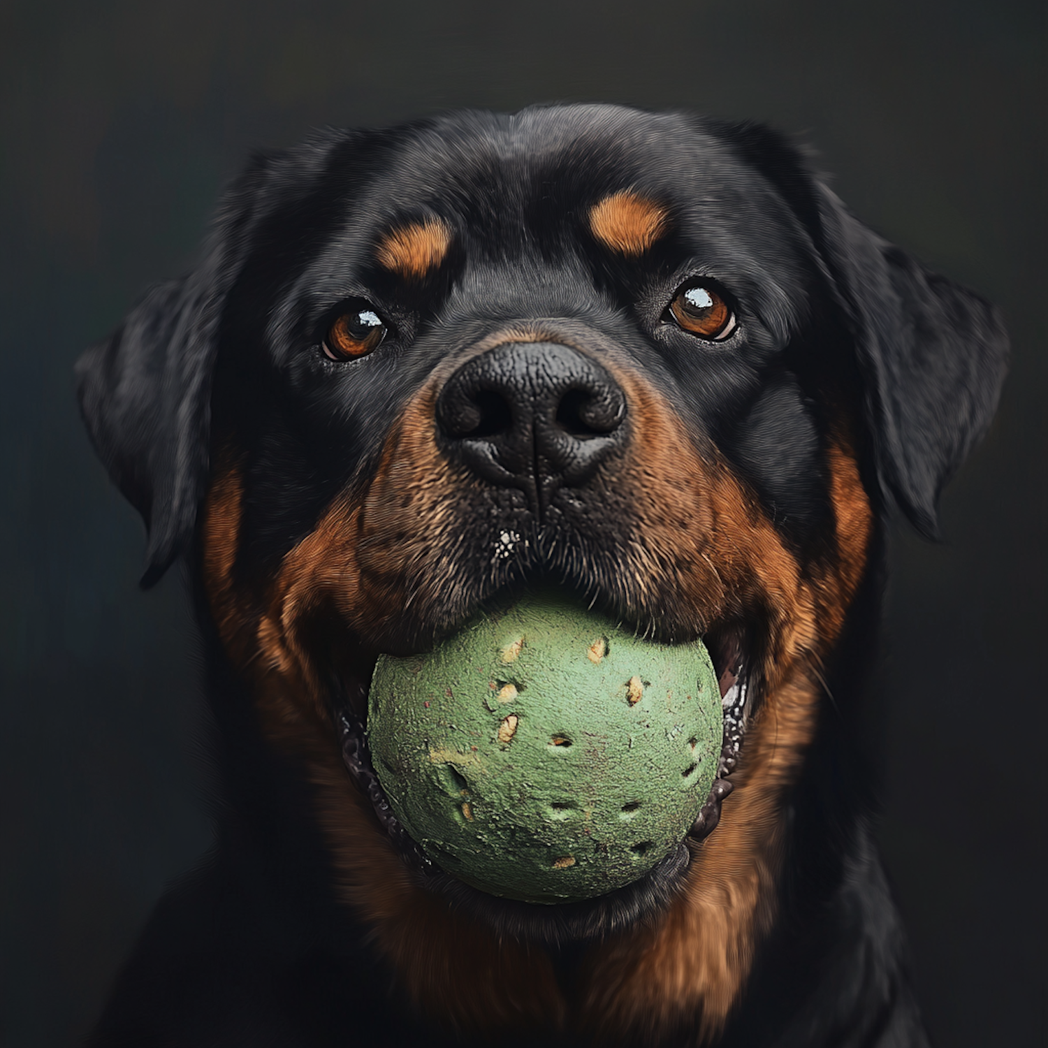 Rottweiler with a green ball in its mouth, showcasing a playful and attentive expression against a dark background.