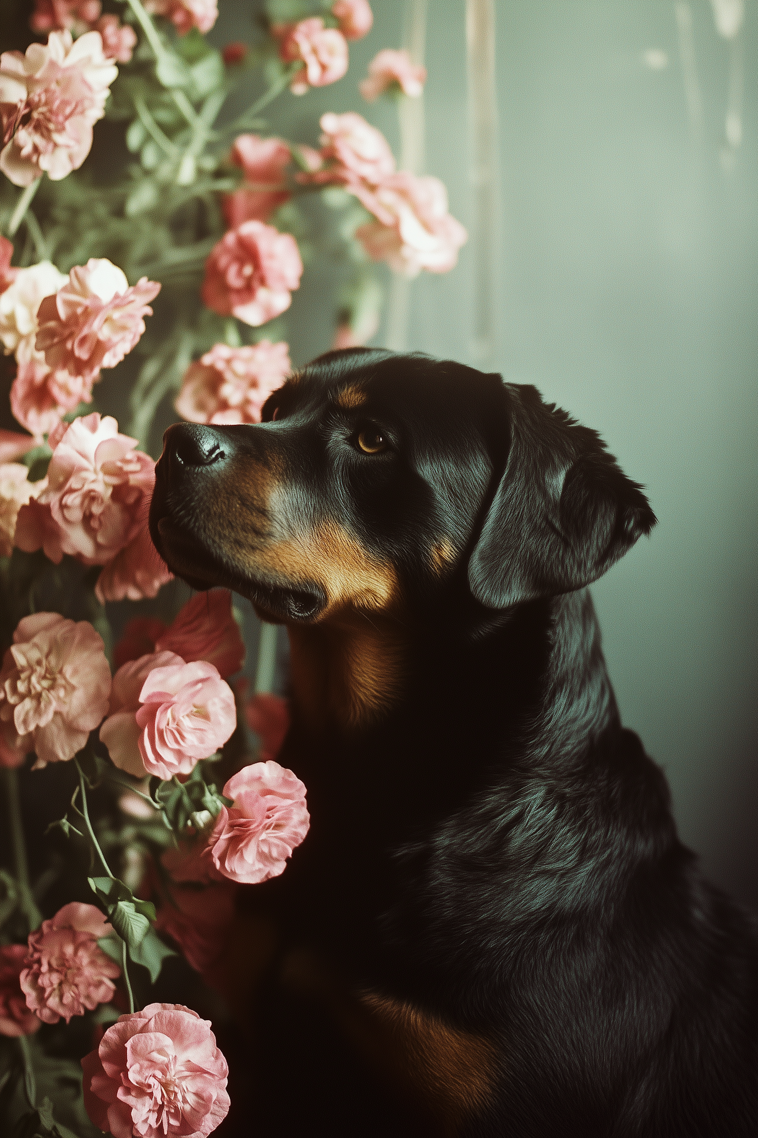Rottweiler dog sitting beside blooming pink roses, creating a serene and harmonious scene with soft lighting and a muted green background.