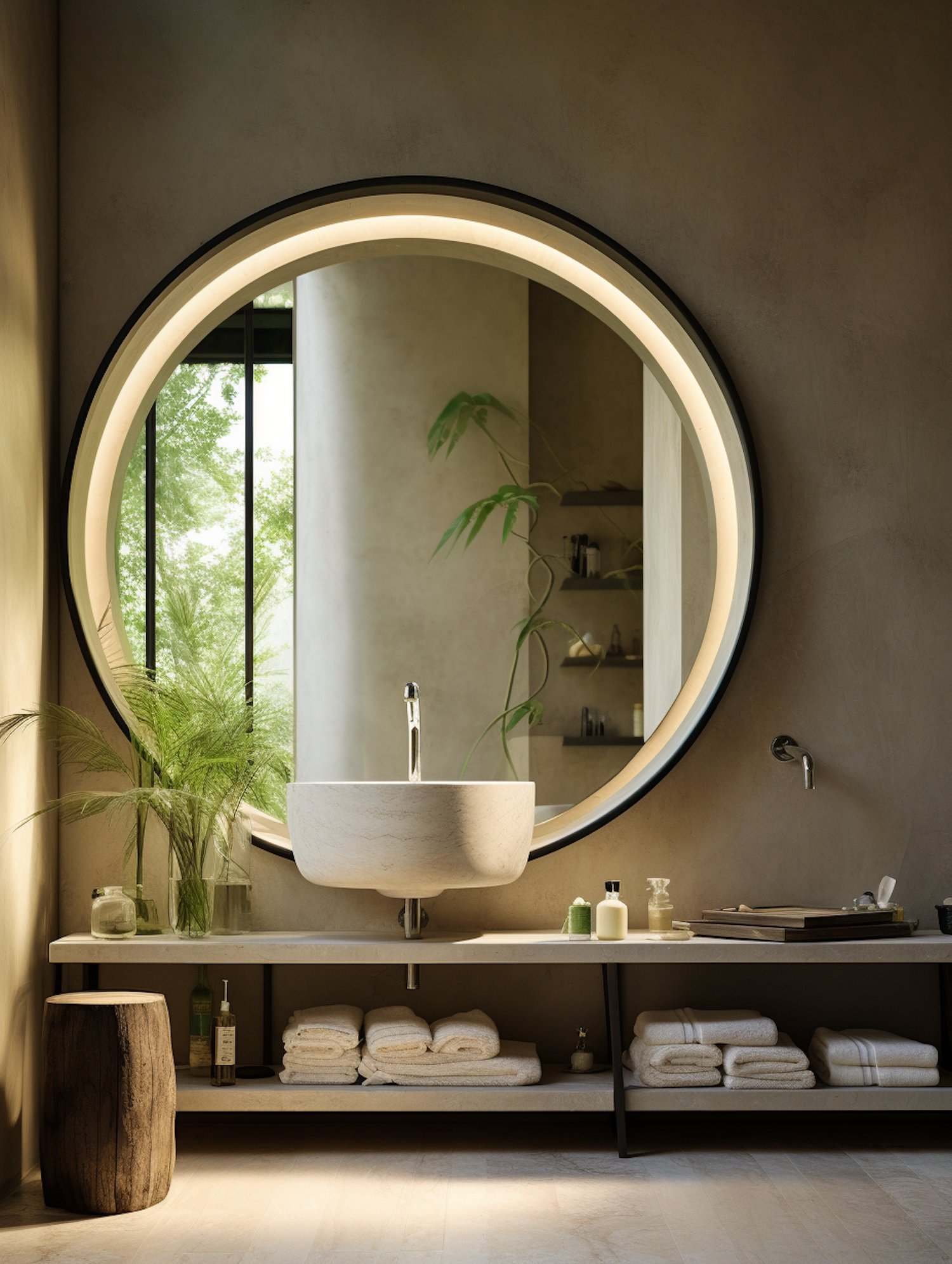 Modern bathroom with a circular backlit mirror, stone sink, and natural accents like plants and wood, creating a serene ambiance.