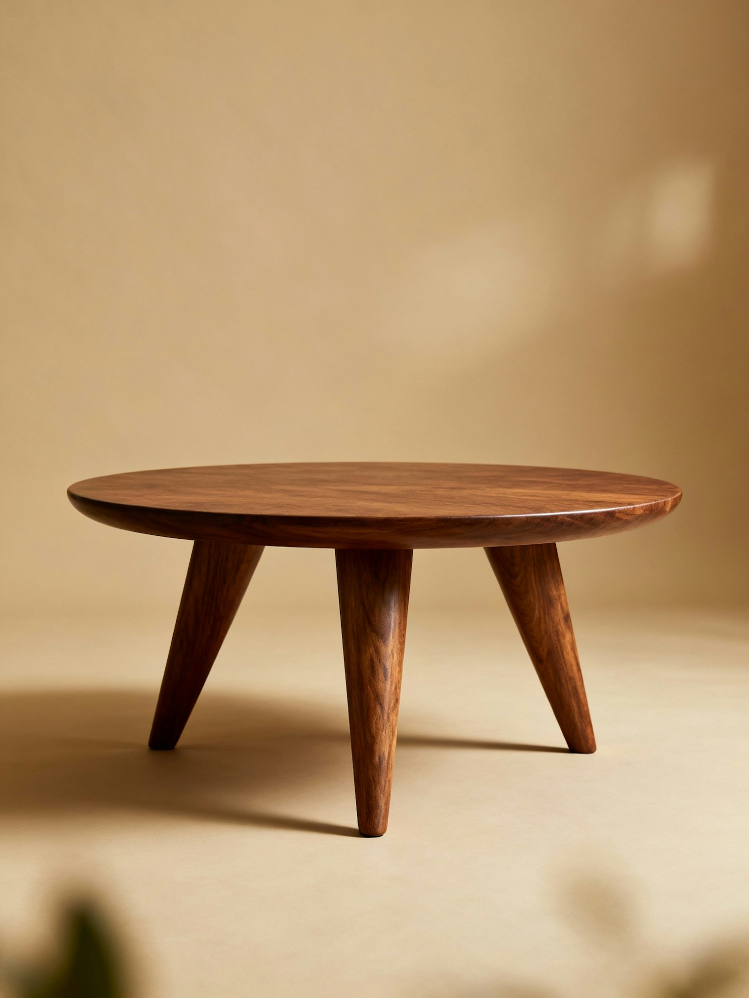 Professional studio photography, neutral beige background, soft diffused lighting, sharp focus. A round mid-century coffee table made of solid walnut wood with a smooth polished surface. The table has three sculptural tapered legs, slightly angled for stability. The design is minimalist, with a timeless retro-modern silhouette that highlights craftsmanship and natural wood grain. Photographed from the front, centered in the frame, showing the table surface and legs symmetrically.