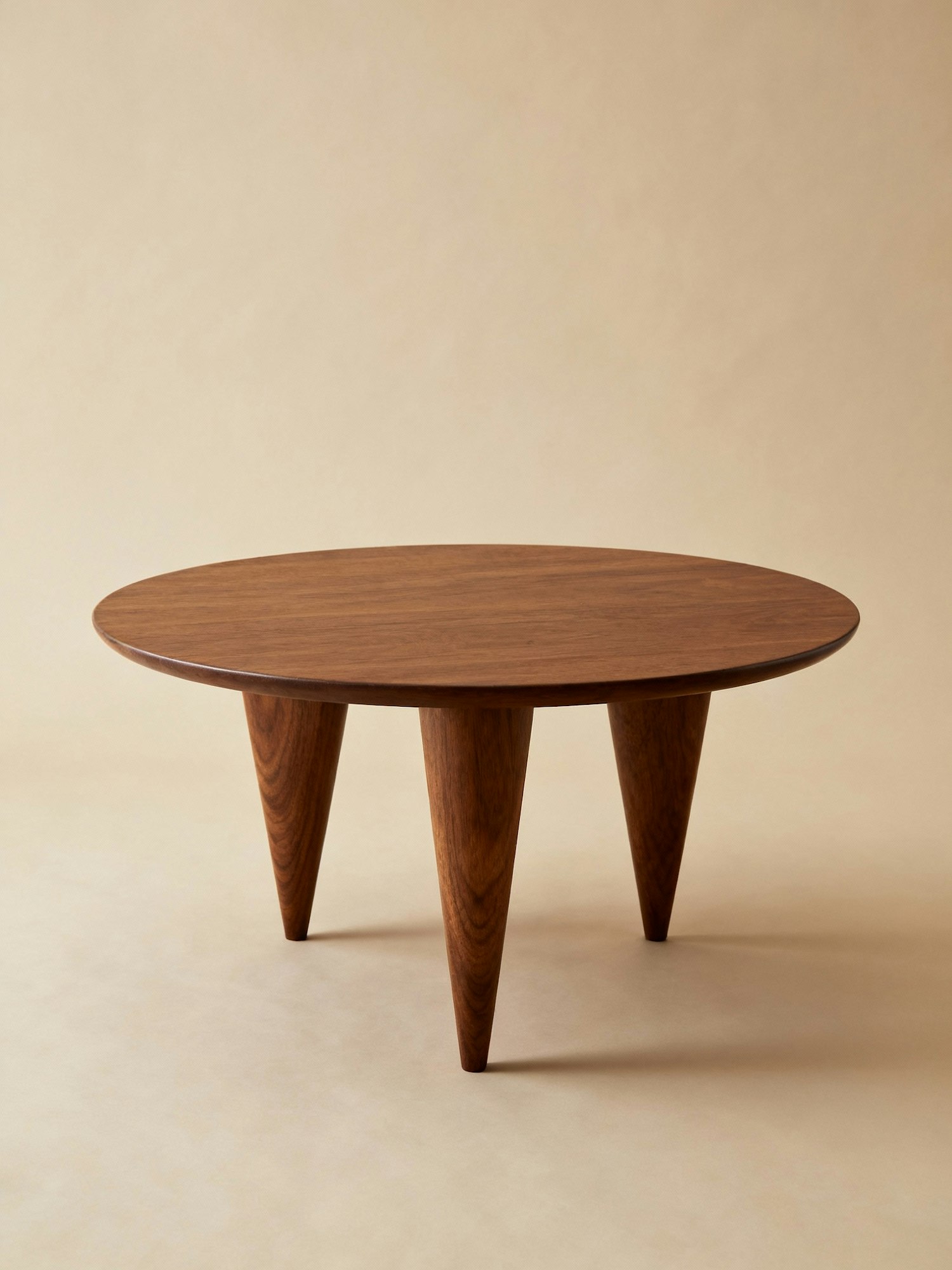 Professional studio photography, neutral beige background, soft diffused lighting, sharp focus. A round mid-century coffee table made of solid walnut wood with a smooth polished surface. The table has three sculptural tapered legs, slightly angled for stability. The design is minimalist, with a timeless retro-modern silhouette that highlights craftsmanship and natural wood grain. Photographed from the front, centered in the frame, showing the table surface and legs symmetrically.