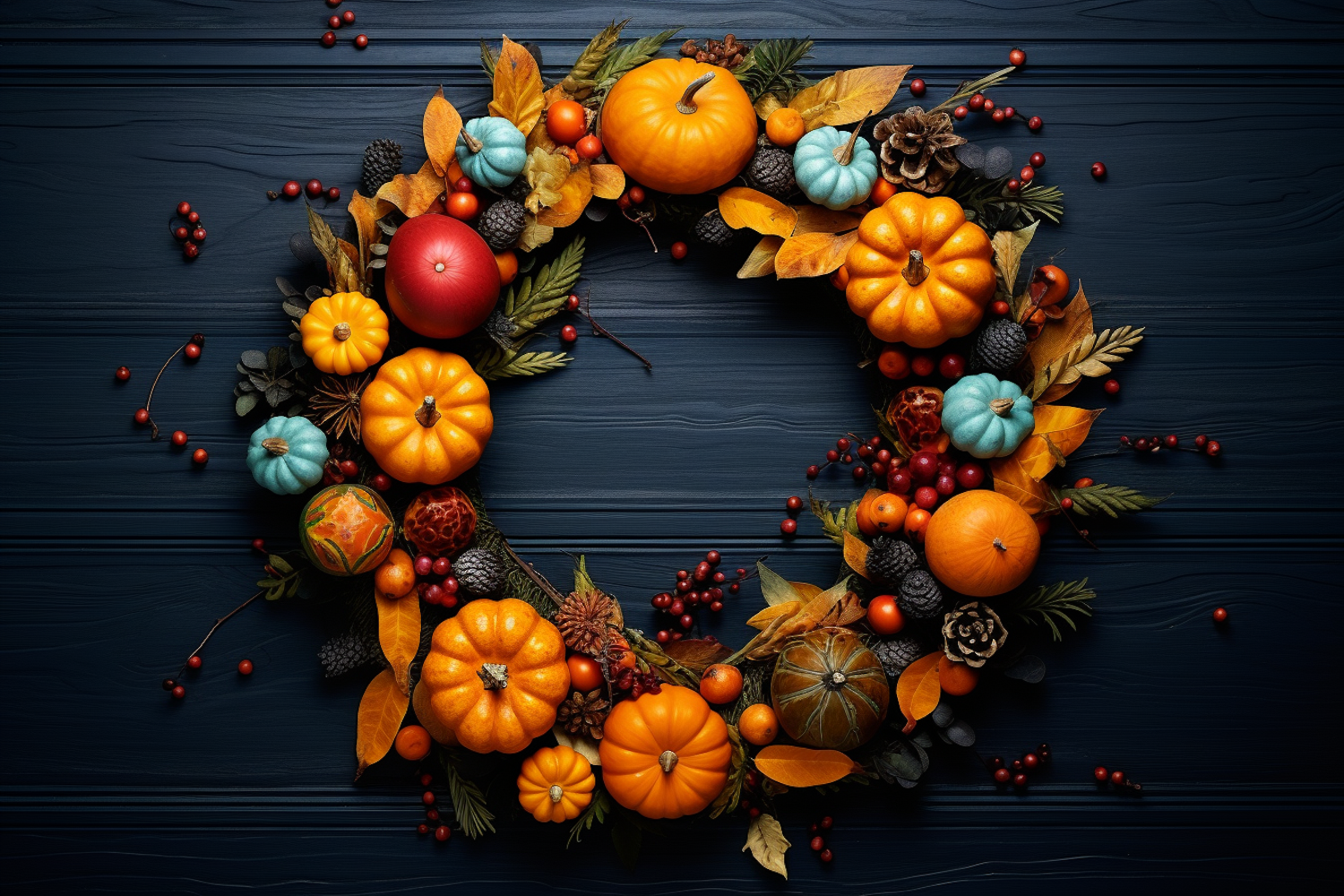 Colorful autumn wreath with pumpkins, berries, and leaves on a dark wooden background, perfect for fall decor inspiration.