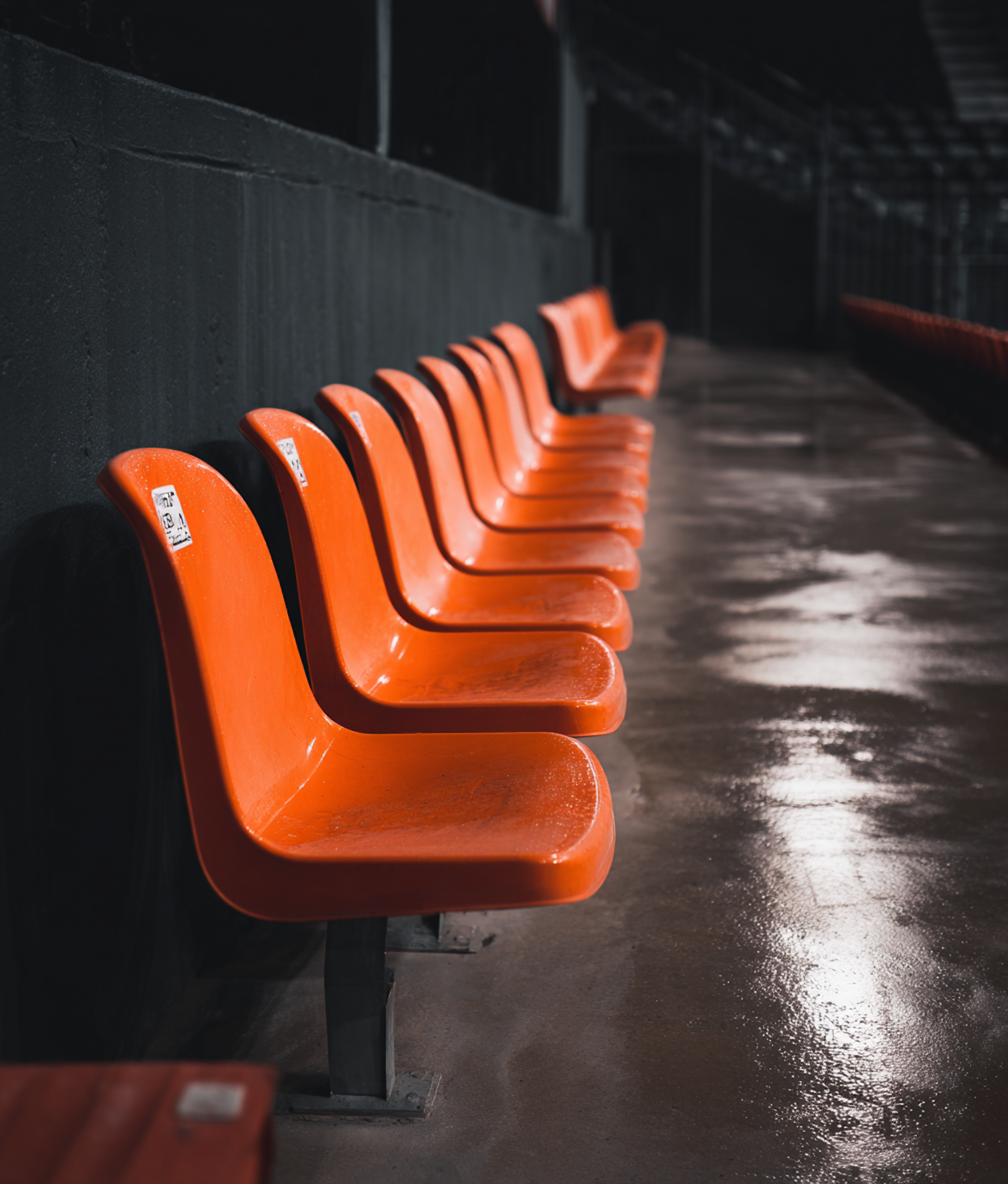 A row of bright orange stadium seats on a wet floor, creating a striking contrast against the dark background.
