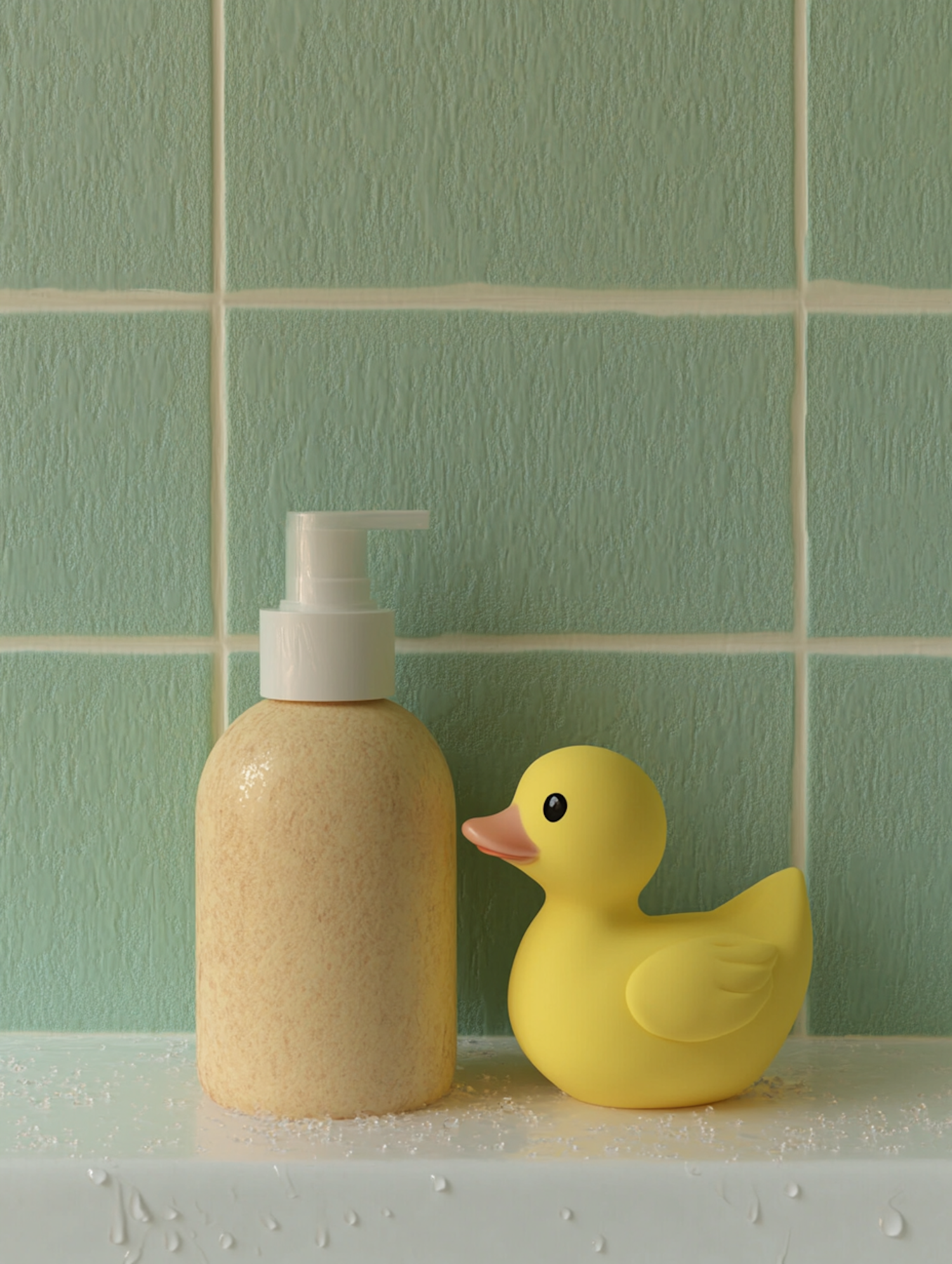Yellow rubber duck and beige pump bottle on a bathroom shelf with green tiles. Water droplets and soap suds add a fresh touch.