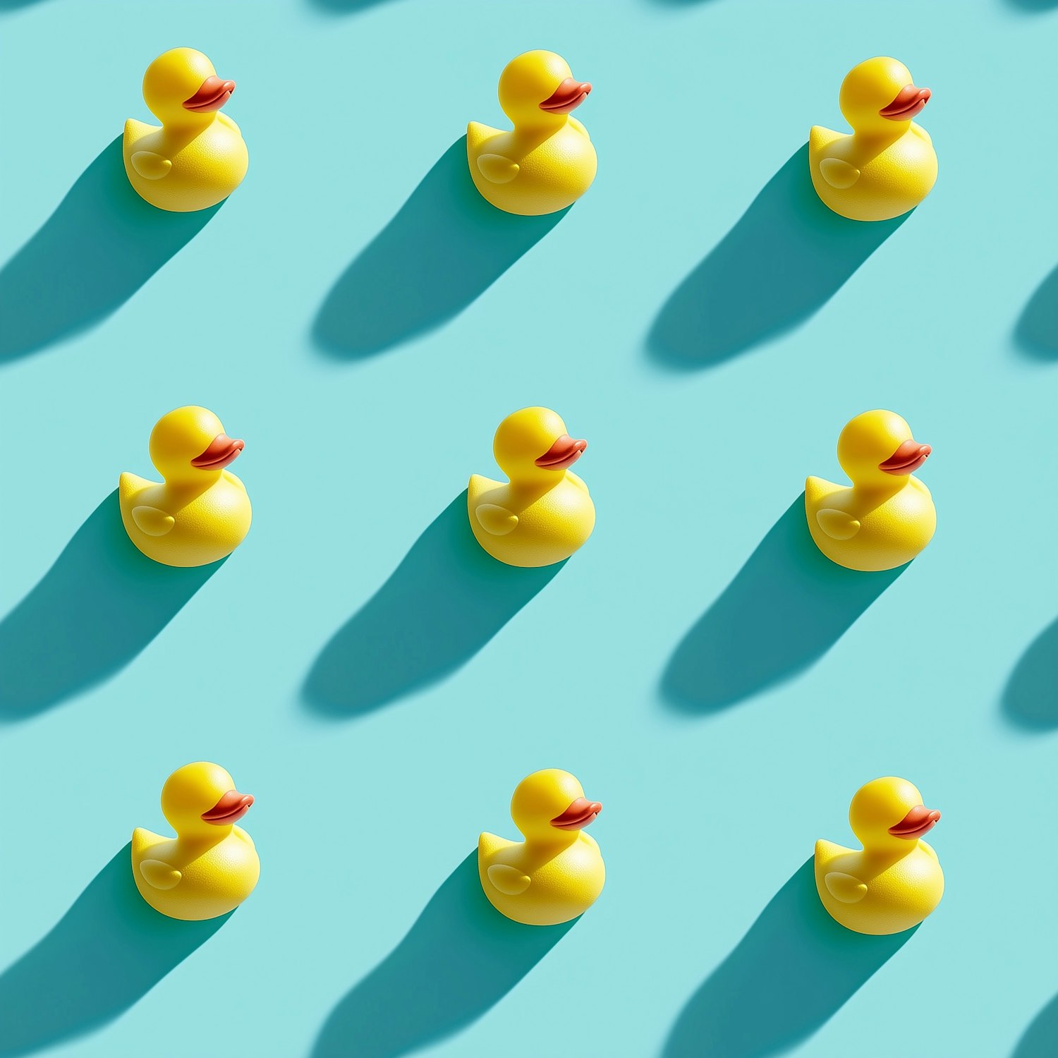 Bright yellow rubber ducks arranged in a grid on a turquoise background, casting soft shadows for a playful and vibrant aesthetic.