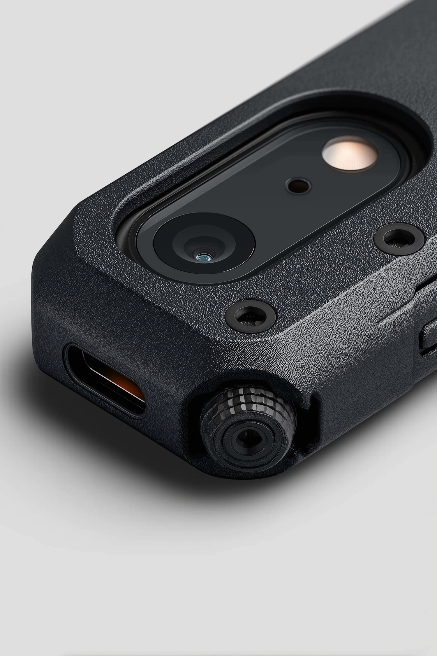 Close-up of a rugged camera device with a textured black casing, lens, flash, and USB-C port, designed for durability and outdoor use.