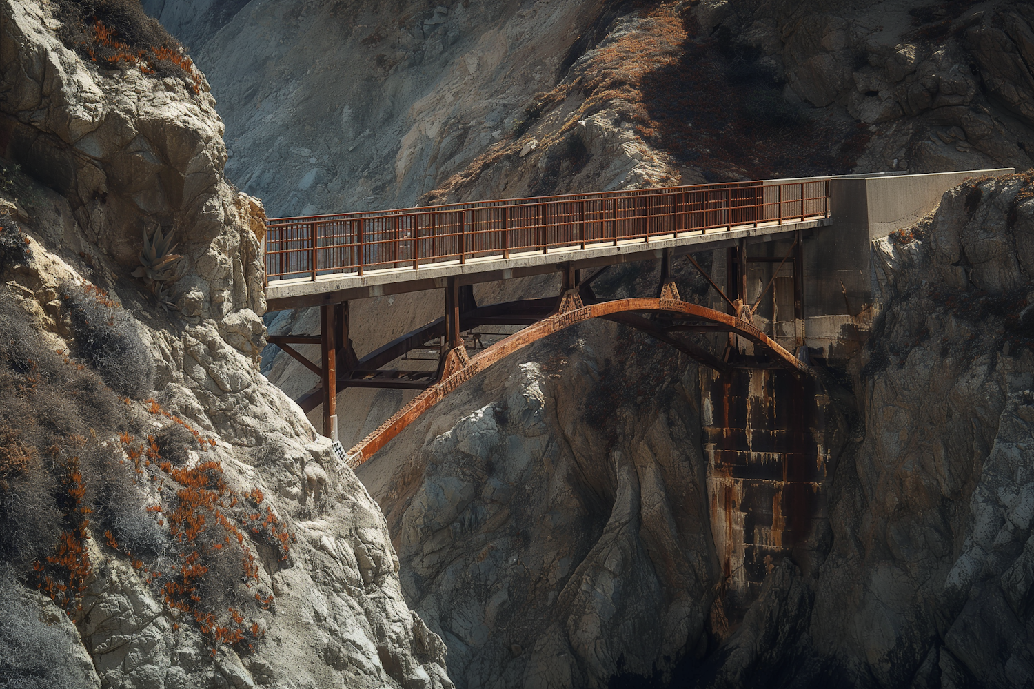Rustic bridge with reddish-brown railings spans a rocky gorge, contrasting with pale rocks and orange-brown foliage.