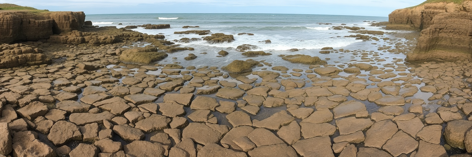 Rugged coastal scene with hexagonal rock formations and ocean waves under a clear blue sky. Dramatic cliffs frame the shoreline.
