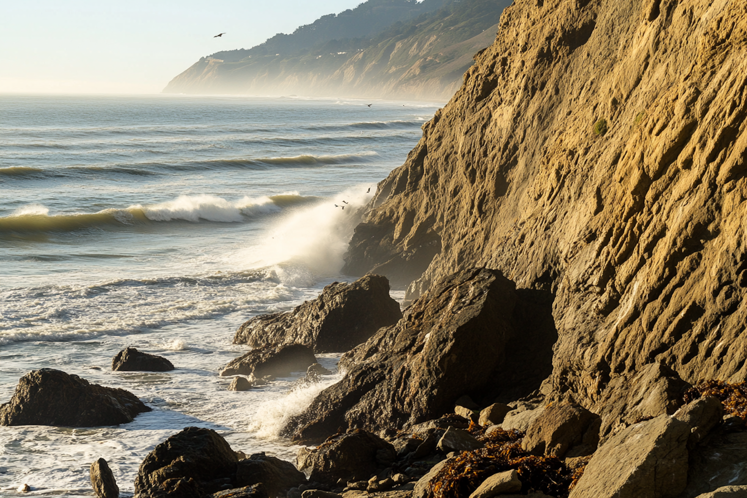 Majestic coastal cliffs with crashing waves and birds in flight, bathed in warm sunlight, creating a stunning natural seascape.