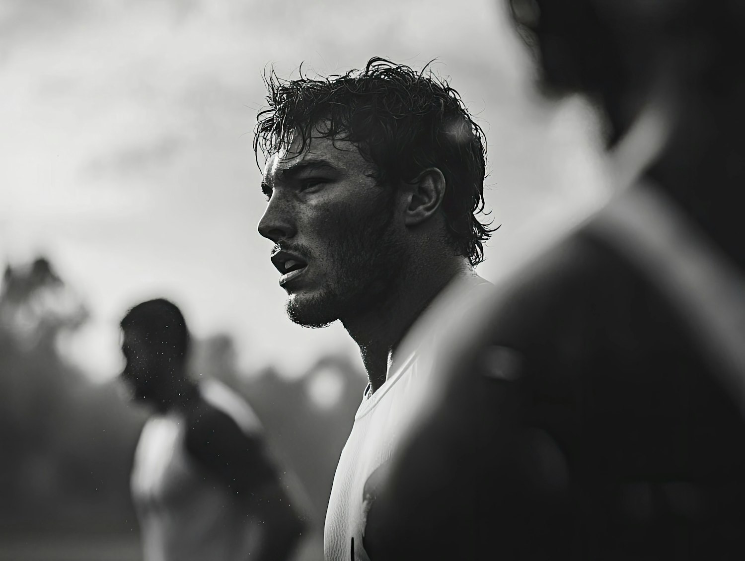 Black-and-white close-up of a rugged man with dirt on his face, intense expression, and blurred figures in the background. Raw and dramatic.