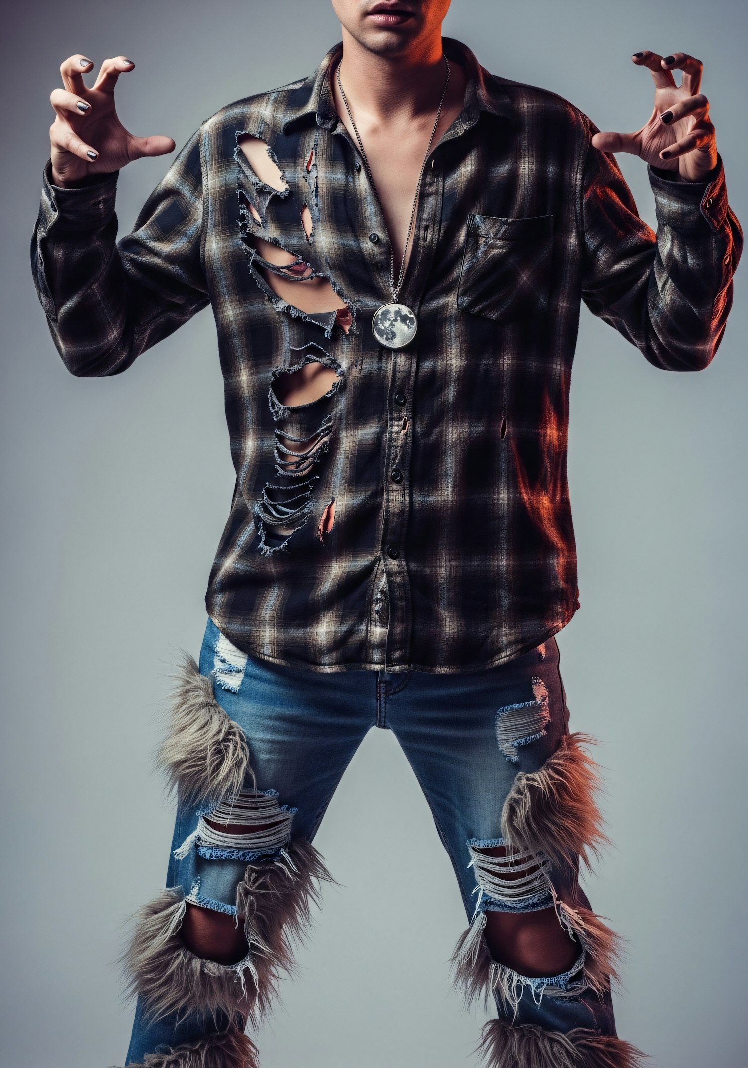 A person in a torn plaid shirt and fur-accented jeans strikes a claw-like pose, wearing a moon pendant. A bold and edgy fashion statement.