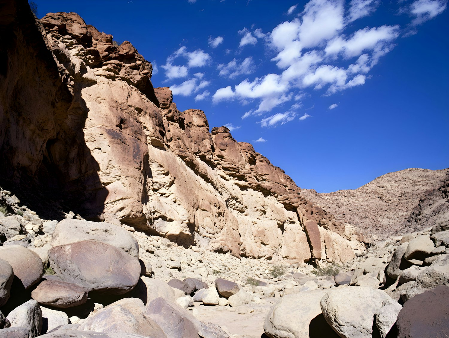 Rugged desert landscape with towering rock formations, blue sky, and scattered boulders. Striking contrast of colors and textures.