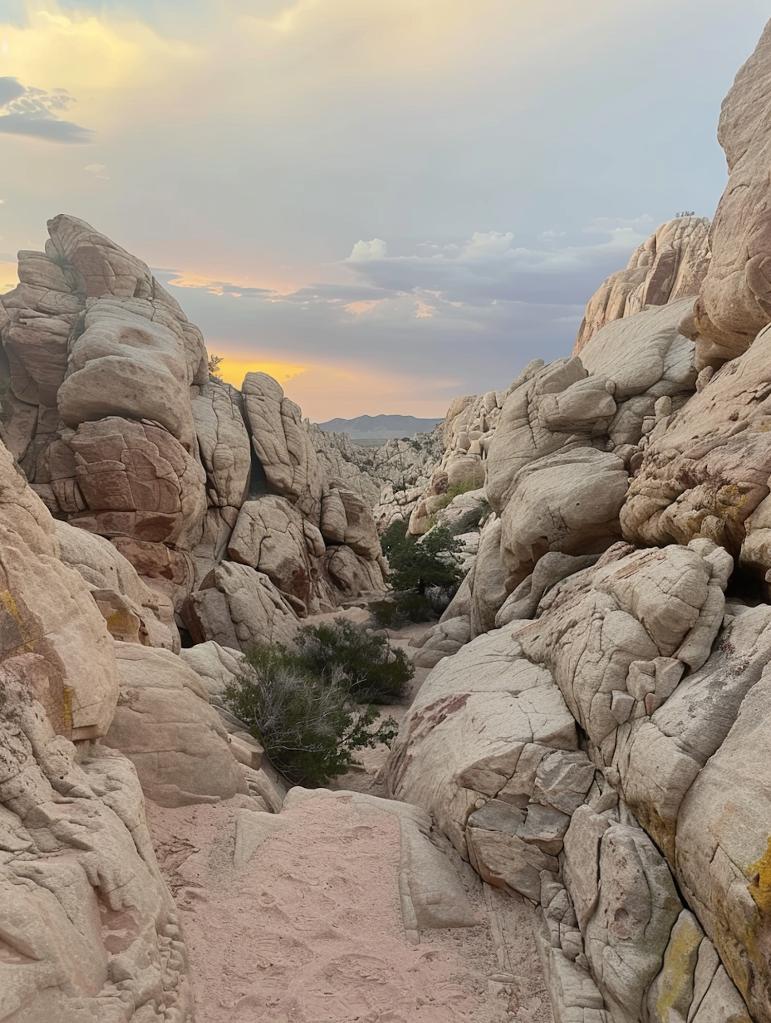 Rugged desert canyon with weathered rock formations and sparse vegetation under a pastel sky, suggesting sunrise or sunset.