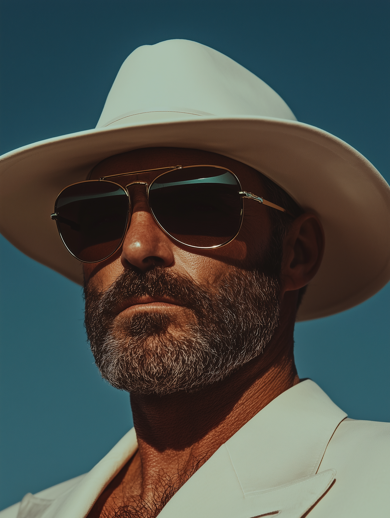 Stylish man with a white hat, aviator sunglasses, and a salt-and-pepper beard against a vibrant blue sky.