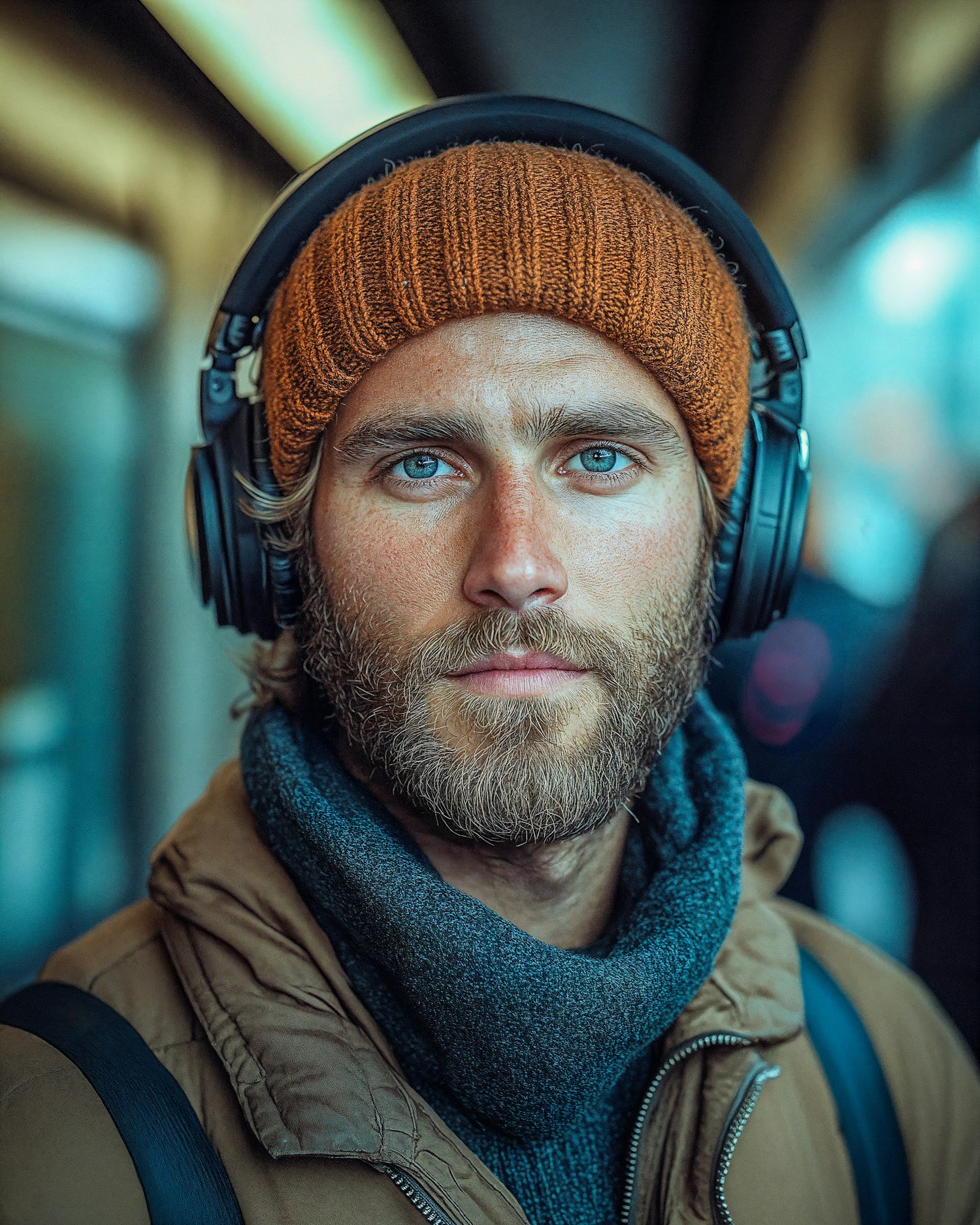 Caucasian man with blue eyes, beard, and orange beanie wearing headphones in a blurred urban setting.