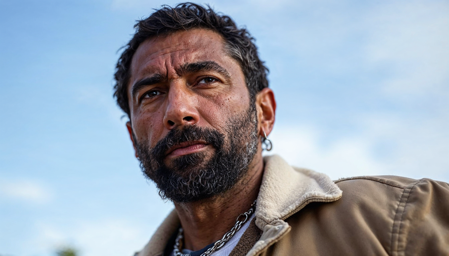 Rugged man with a beard and earring, wearing a tan jacket against a blue sky. Intense gaze and silver chain necklace.