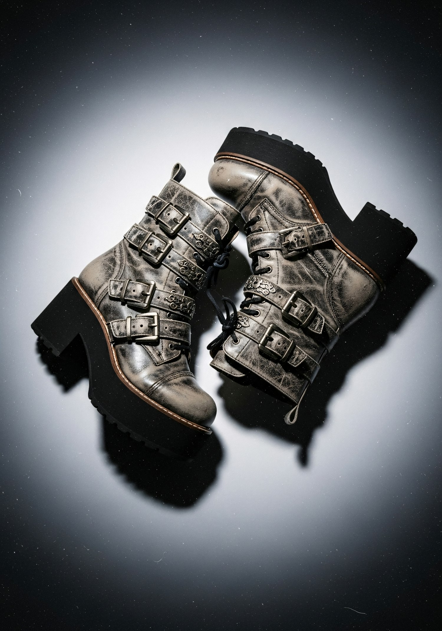 Stylish metallic boots with buckles and thick soles, perfect for a bold and edgy look, showcased against a sleek gradient background.