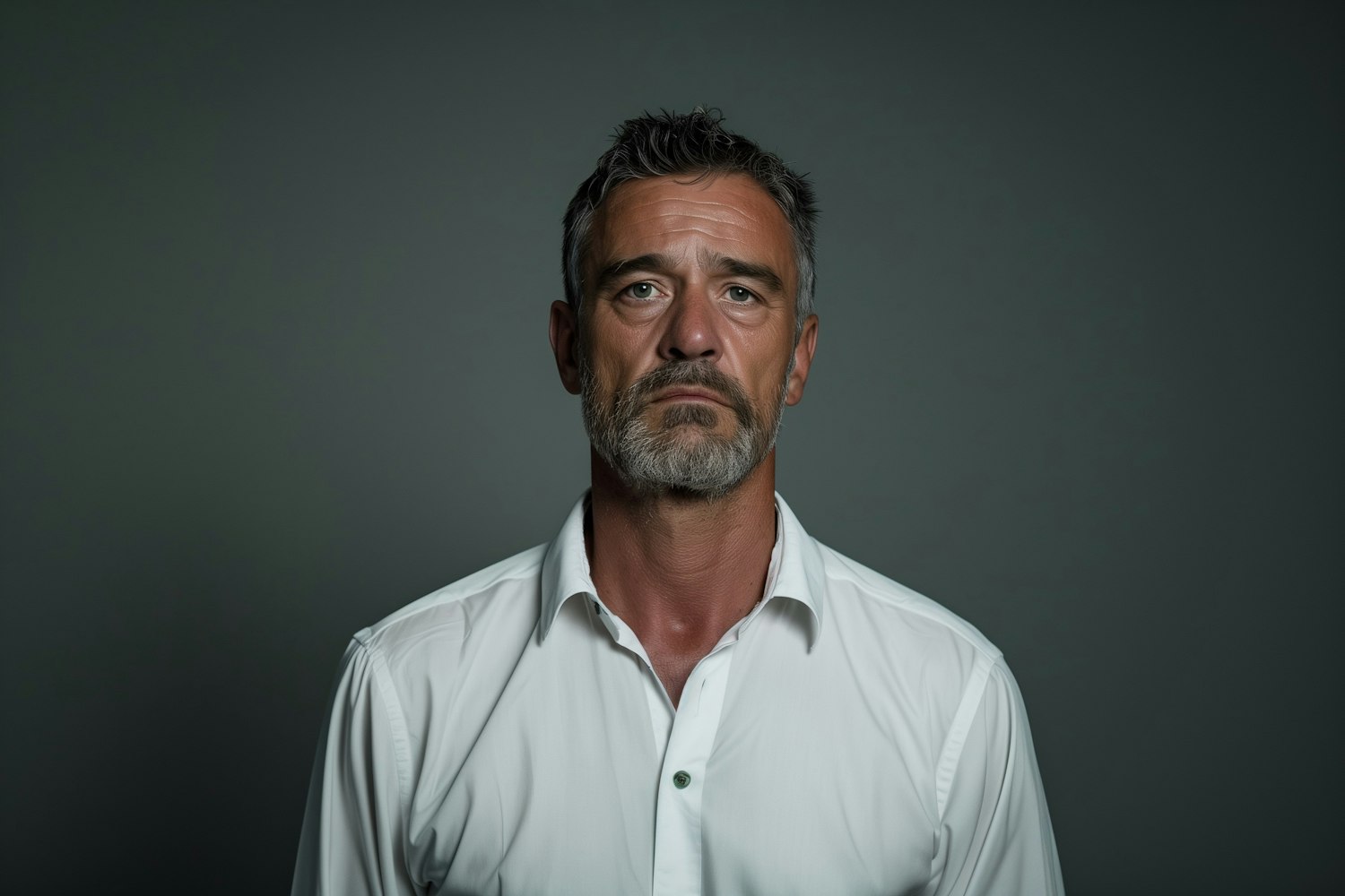 Middle-aged man with salt-and-pepper beard, wearing a white shirt, serious expression, and dark gray background.