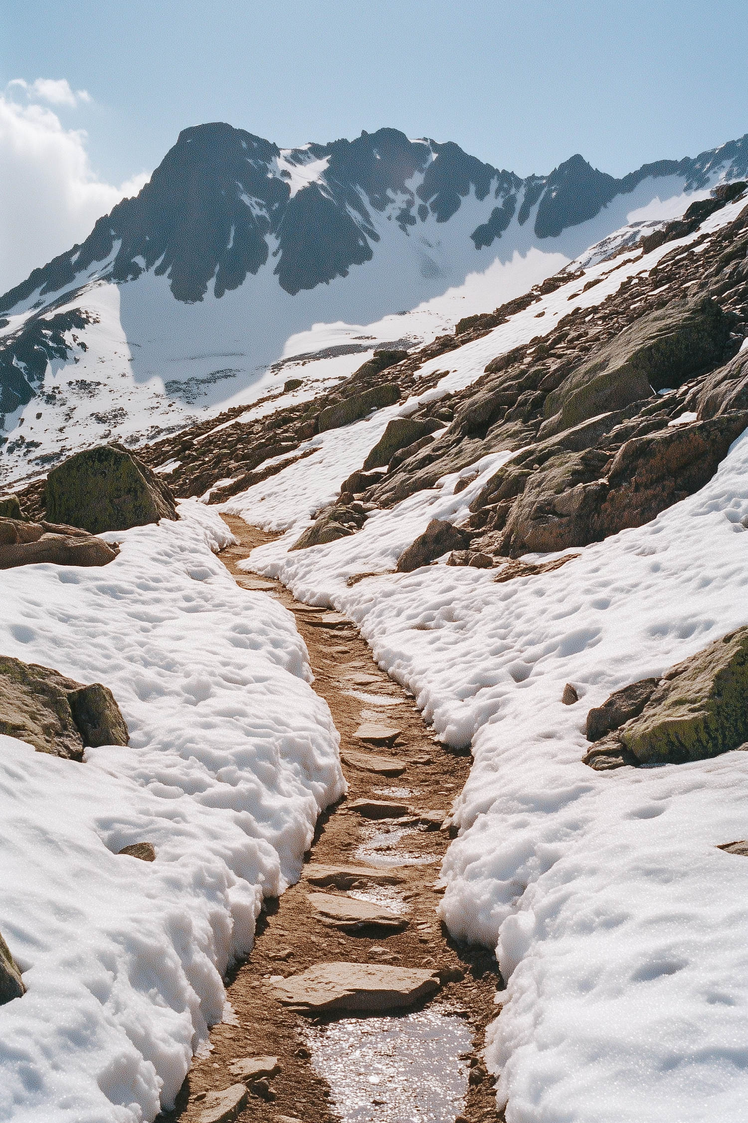 Snowy mountain path with rocky terrain and a towering peak under a clear blue sky, perfect for adventure and exploration.