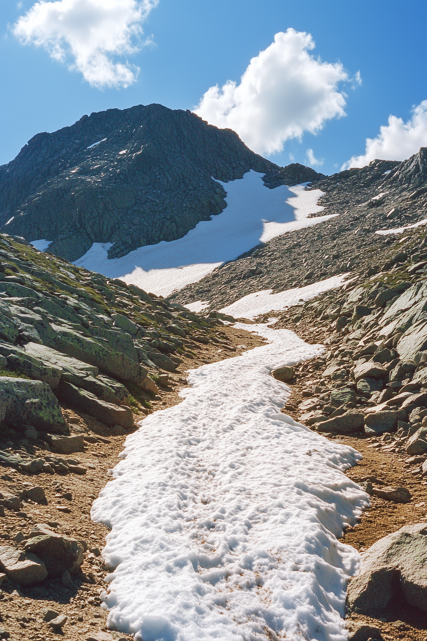 Snow-covered mountain path with rocky terrain under a bright blue sky and fluffy clouds, perfect for adventure seekers.