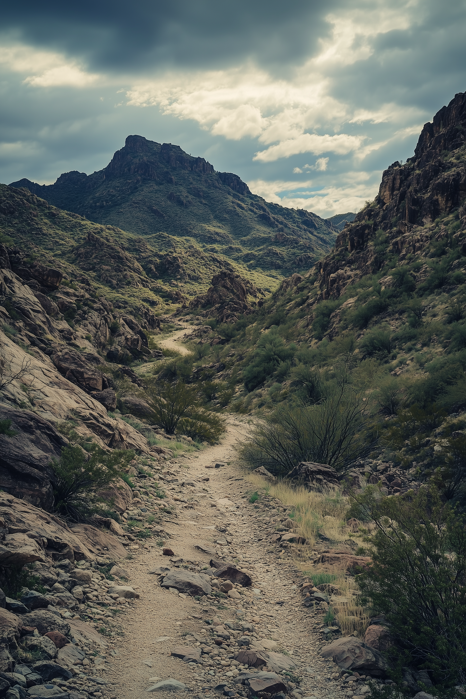 Rugged mountain landscape with a winding path, rocky terrain, and dramatic clouds creating a moody atmosphere.