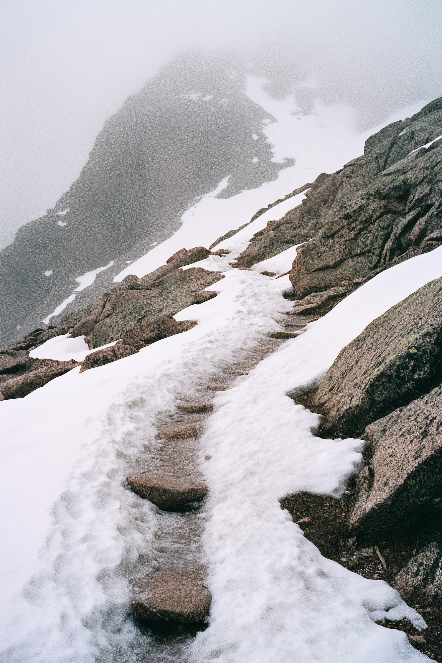 Snow-covered mountain trail with rugged rocks and dense fog, creating a serene and challenging hiking atmosphere.