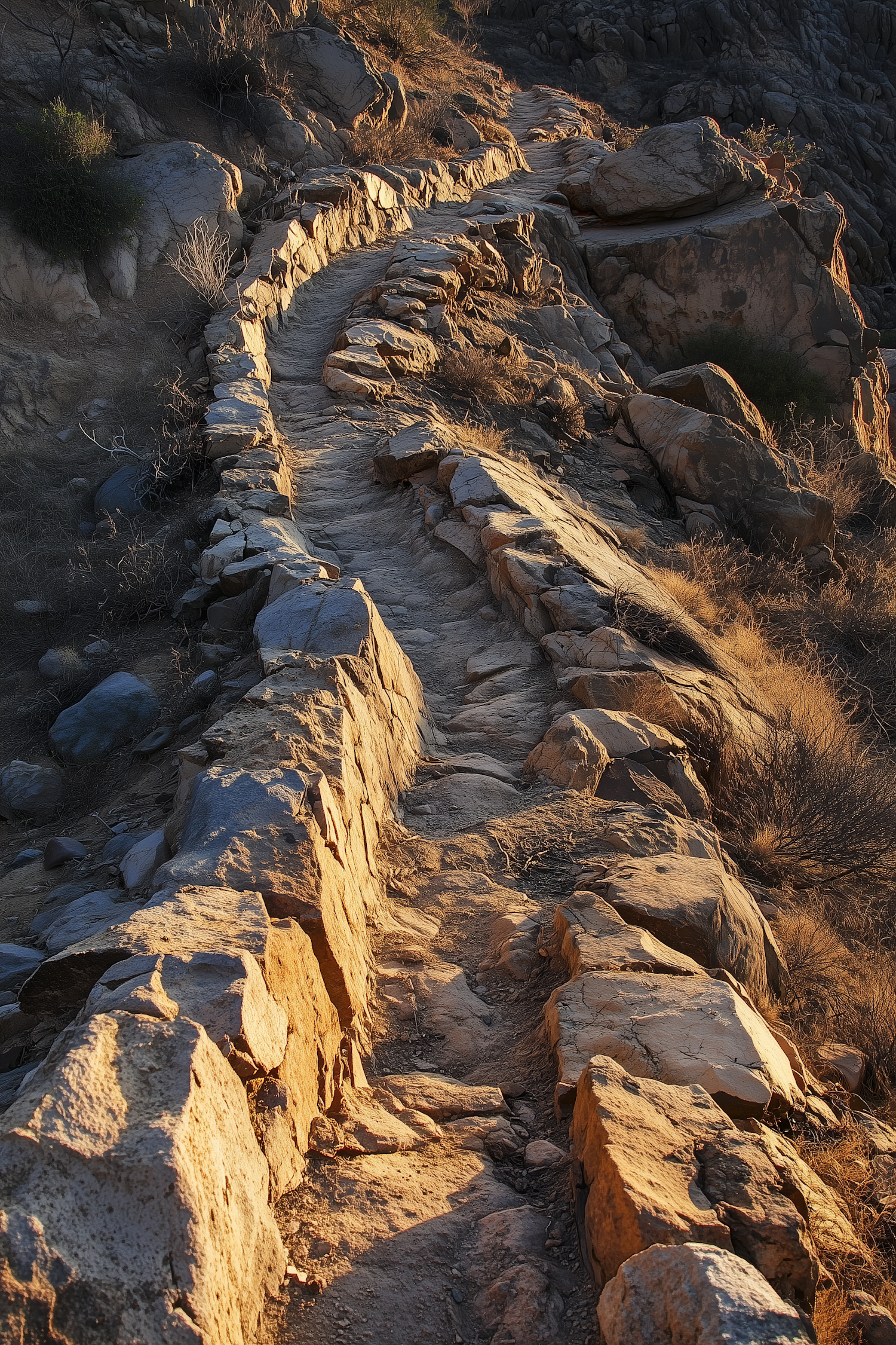 A winding stone path in a rocky, arid landscape, bathed in golden sunlight, with rugged boulders and sparse vegetation.