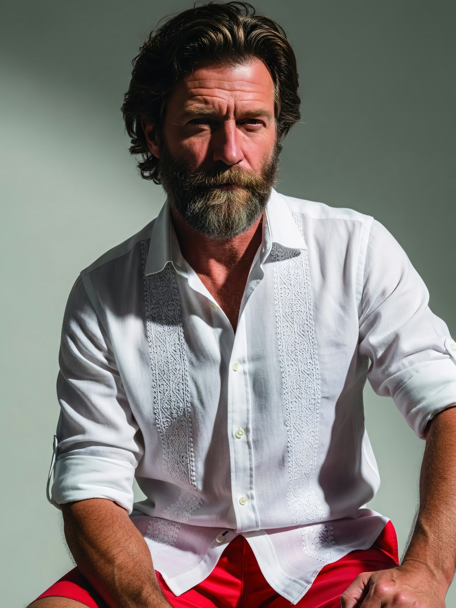 A man with a beard and wavy hair wears a white embroidered shirt and red shorts, seated against a neutral background.