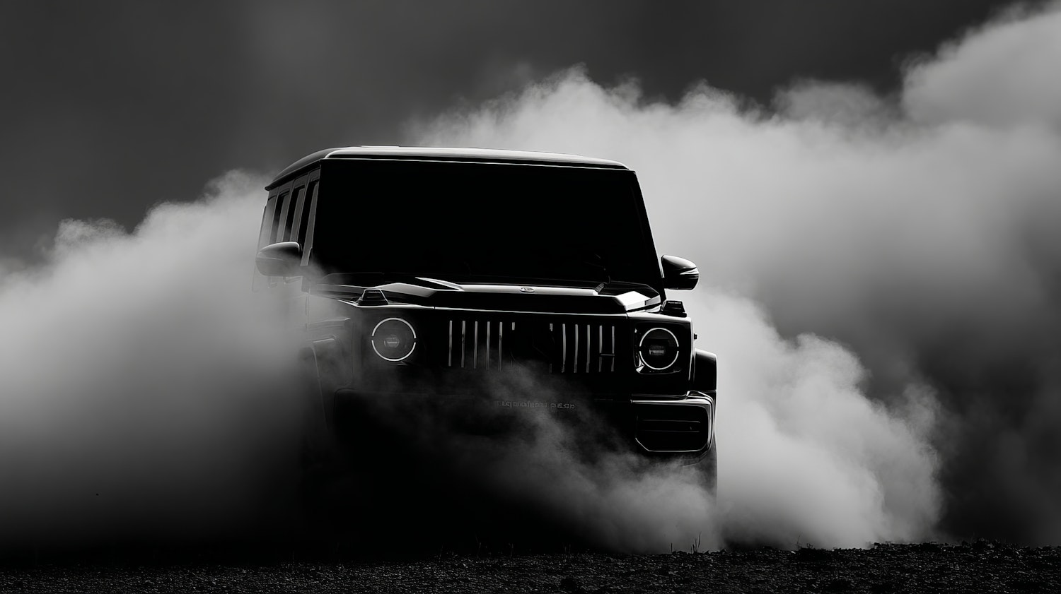 A powerful SUV emerges from a cloud of dust, showcasing its bold design and rugged capability in a dramatic monochromatic scene.